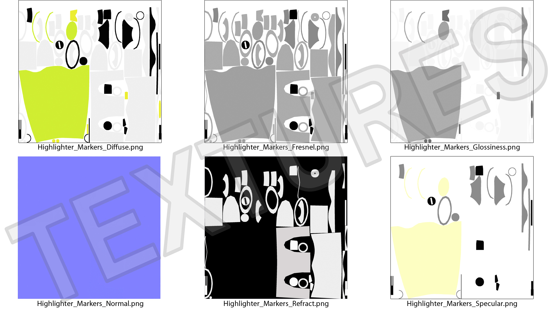 All textures and materials are included and mapped. (All colors can be easily modified.)