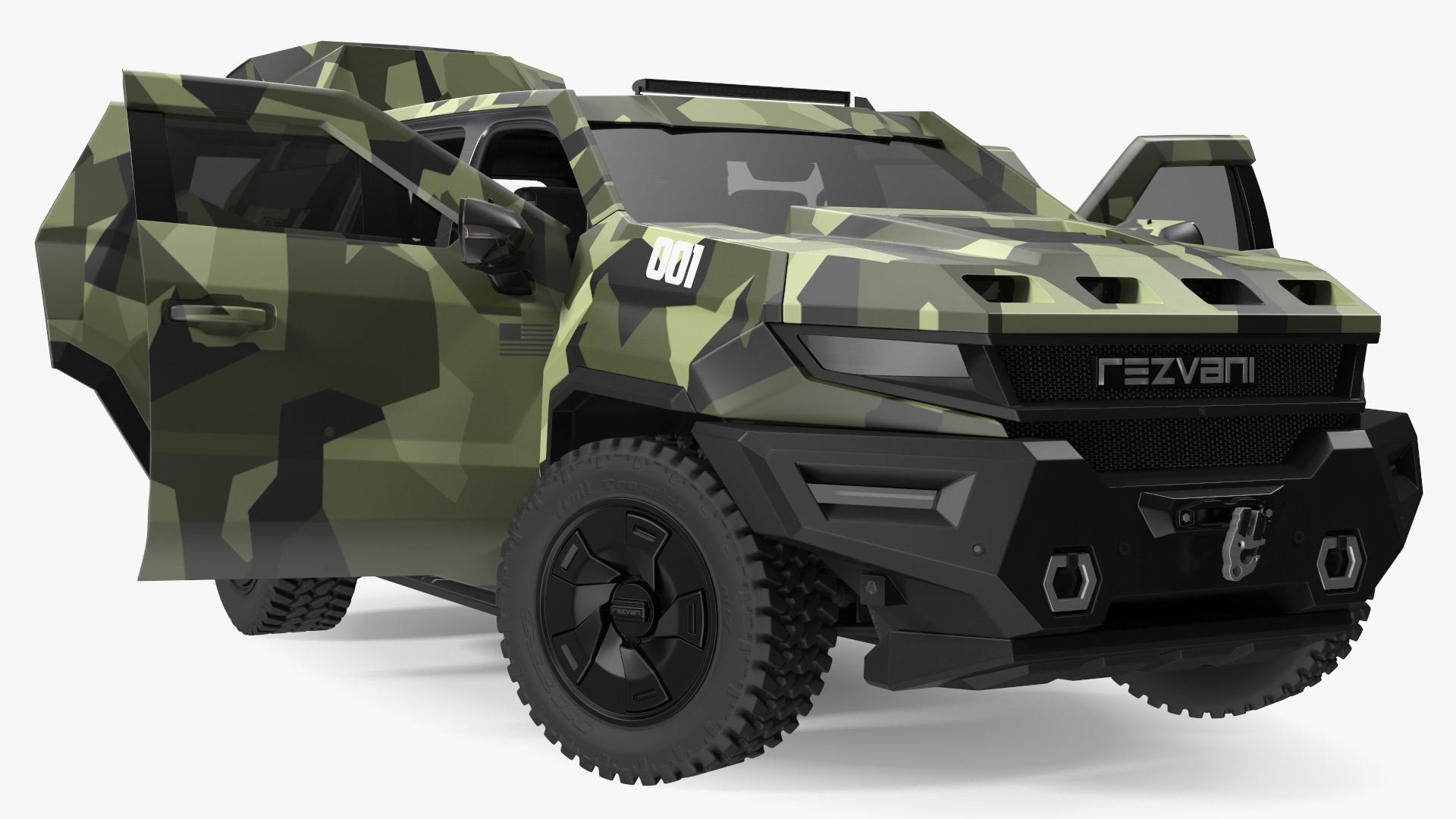 2023 Rezvani Vengeance Armored SUV Camouflage Colored Lights Off Rigged is a 3d model of rugged and luxurious vehicle designed to provide maximum protection and performance.