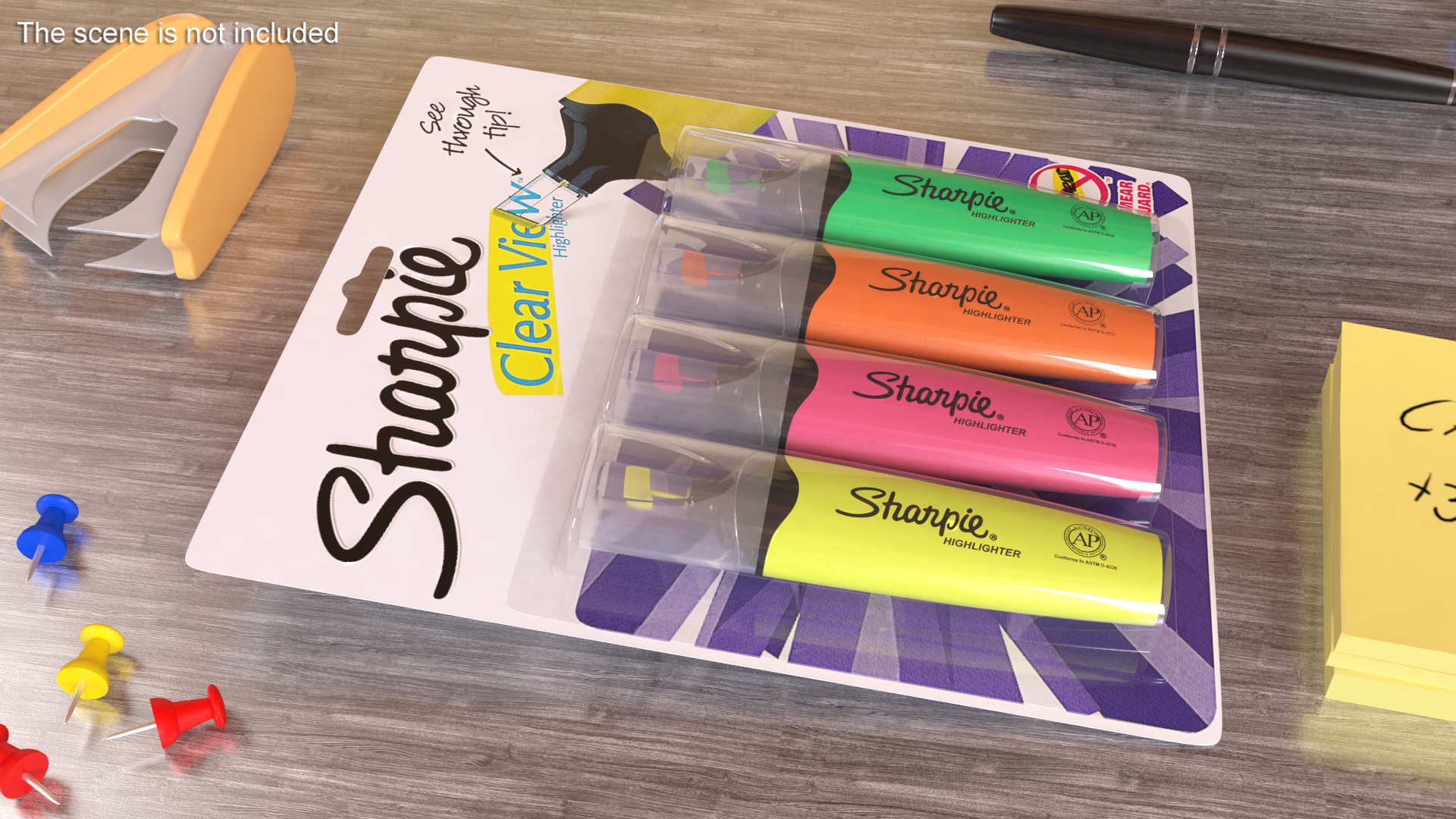 4 Sharpie Highlighter Markers with Package is a three-dimensional model of a package with popular, well known ultra-vivid fluorescent ink markers.