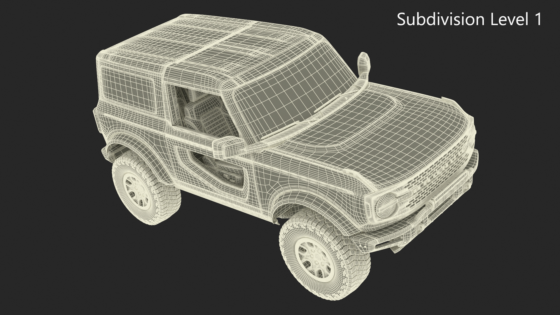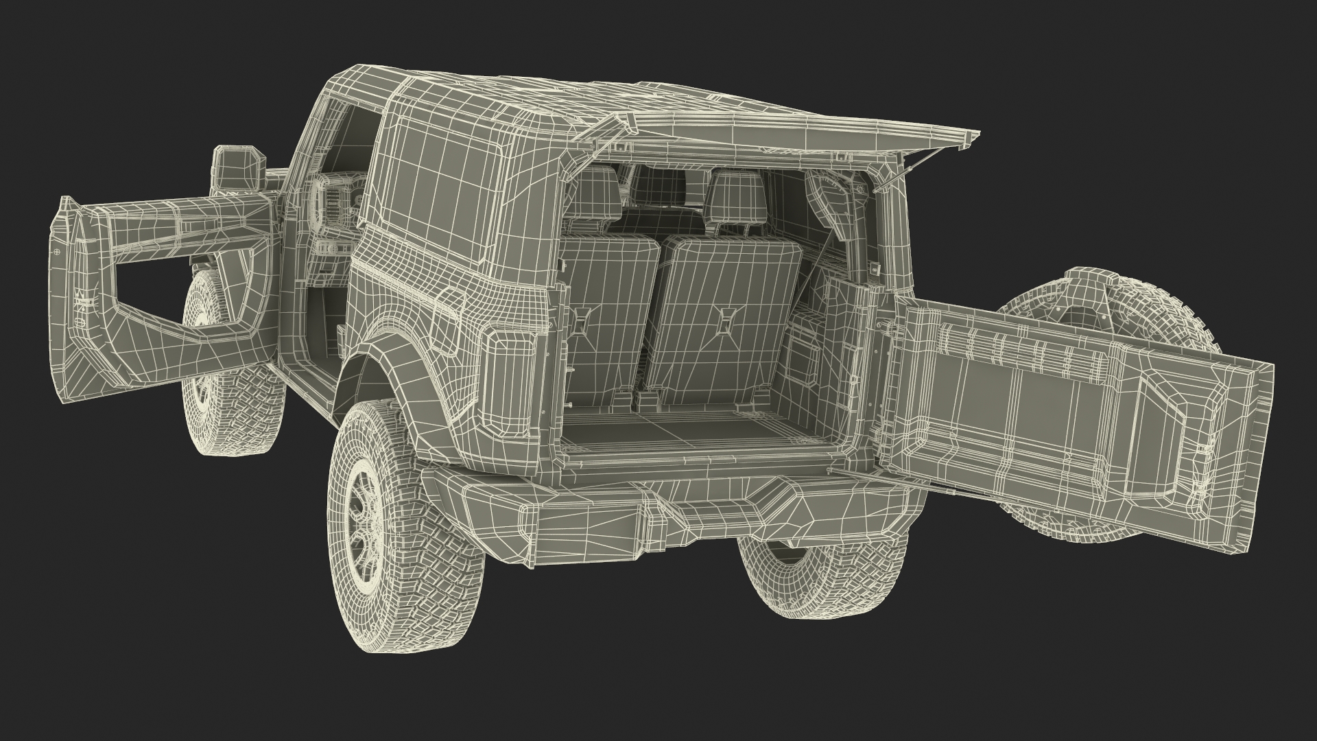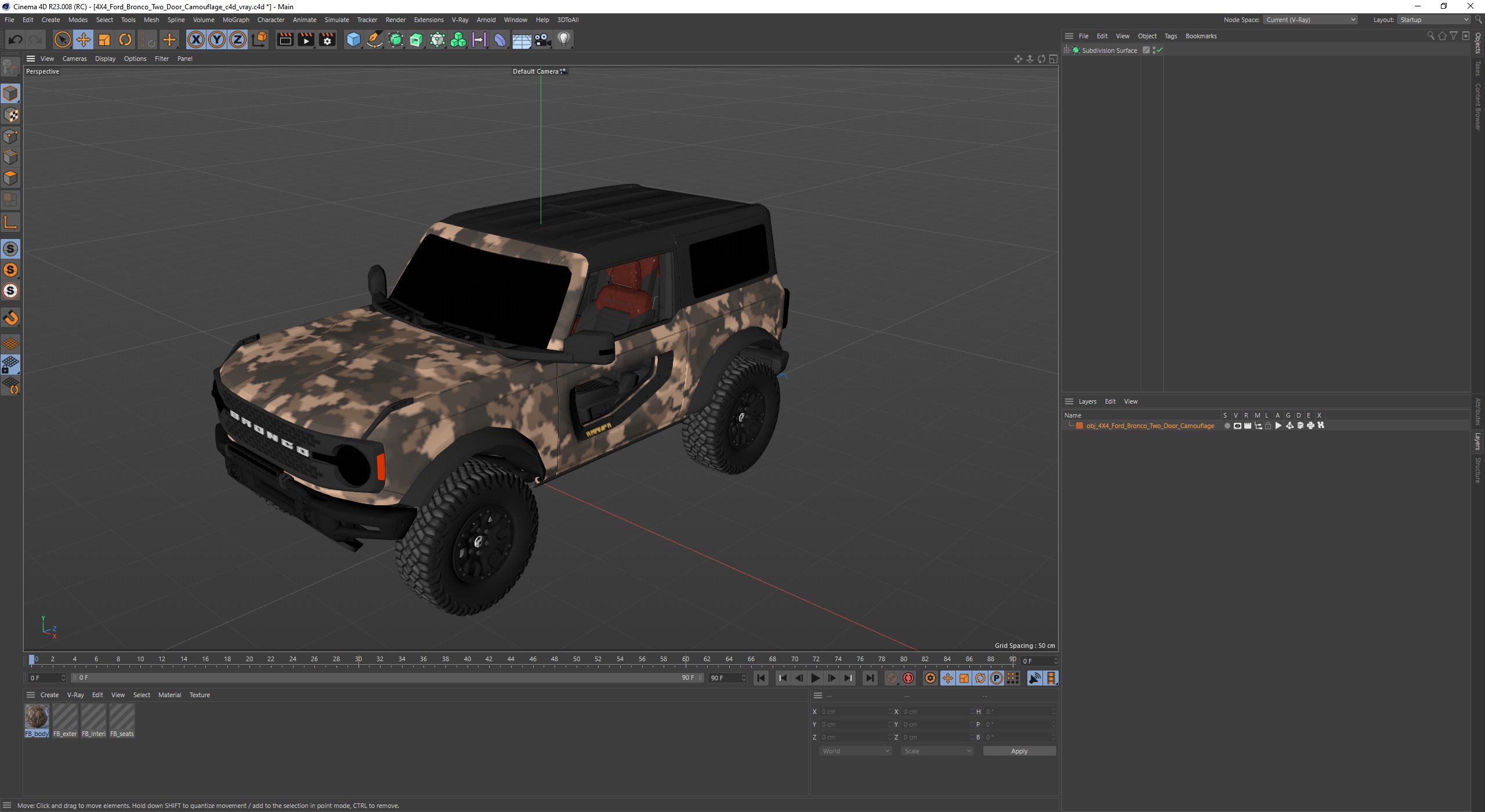 4X4 Ford Bronco Two Door Camouflage is a high quality, photo real 3d model that will enhance detail and realism to any of your rendering projects. The model has a fully textured, detailed design that allows for close-up renders, and was originally modeled in 3ds Max 2020 and rendered with V-Ray. Renders have no postprocessing!