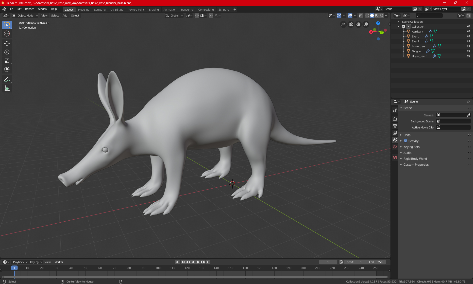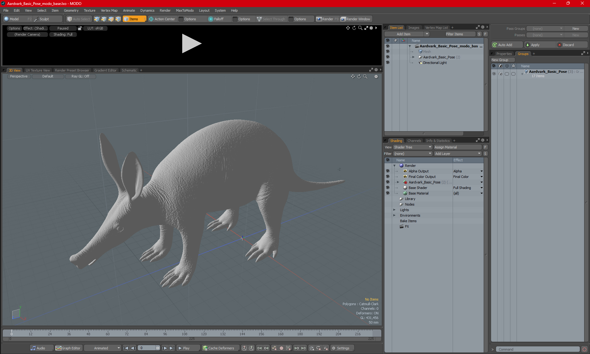 Aardvark Basic Pose is a three-dimensional model of aardvark (anteater, African ant bear, Orycteropus afer, or Cape anteater), which is an medium-sized, African, burrowing, nocturnal, mammal cute animal with a funny long snout, similar to that of a pig, which is used to sniff out food.