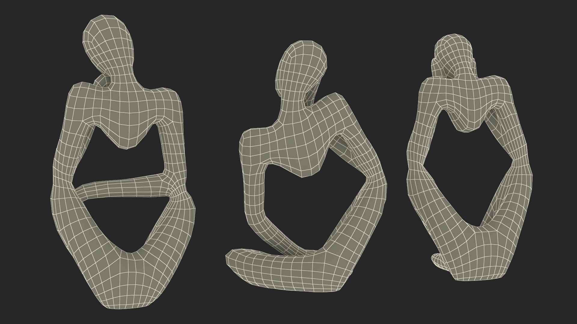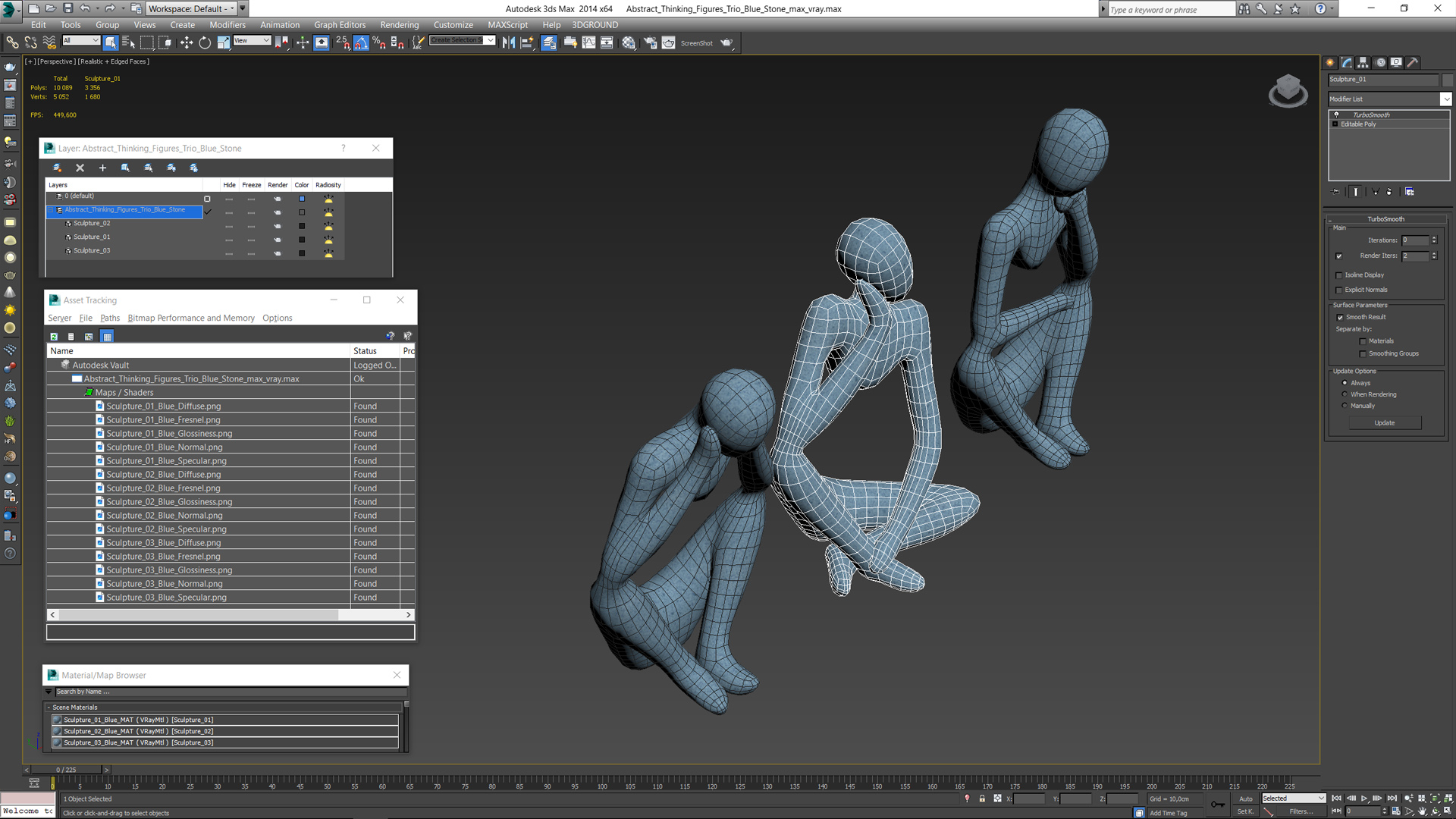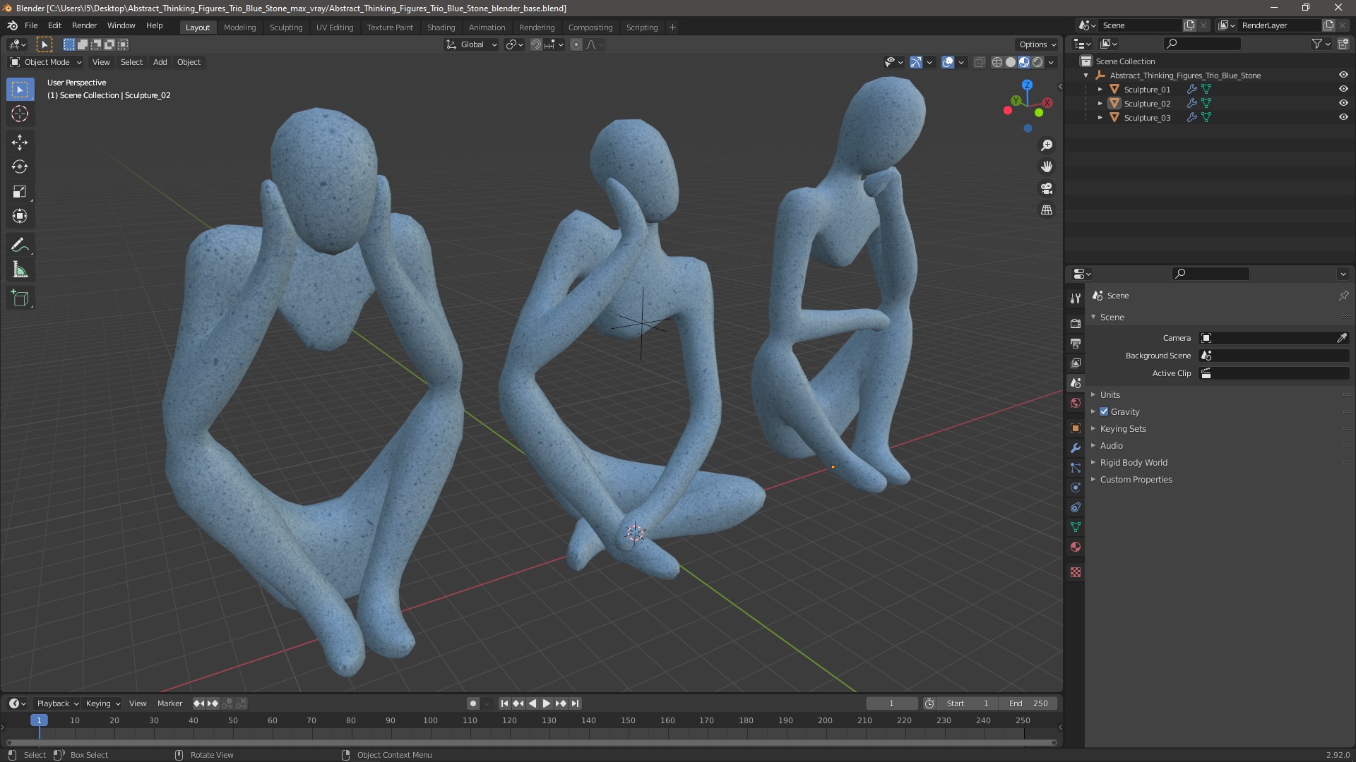 Abstract Thinking Figures Trio Blue Stone is a high quality, photo real 3d model that will enhance detail and realism to any of your rendering projects. The model has a fully textured, detailed design that allows for close-up renders, and was originally modeled in 3ds Max 2020 and rendered with V-Ray. Renders have no postprocessing!