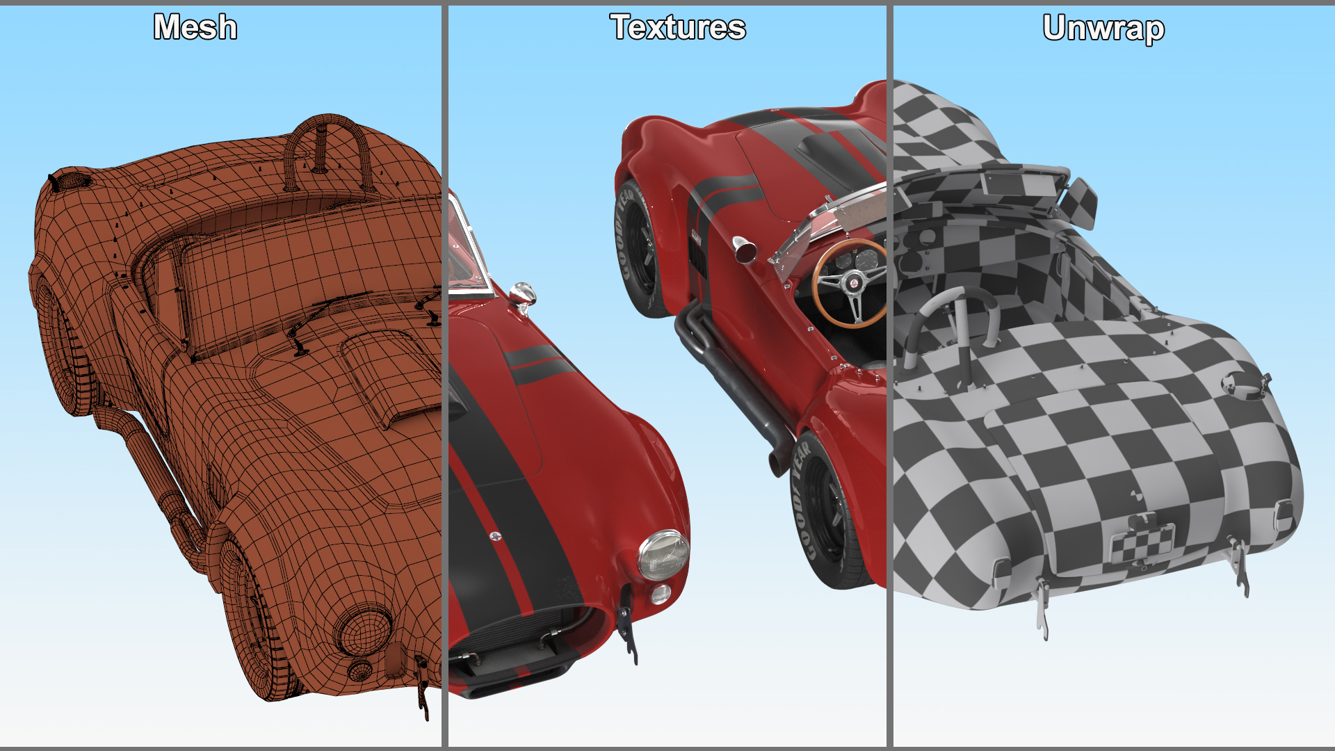 AC Cobra Shelby 1965 Red is a three-dimensional model of AC Shelby 427 Cobra racing retro sports car, born in 1965, which is an ancient 2-door body style roadster which epitomizes the golden era of American muscle cars.