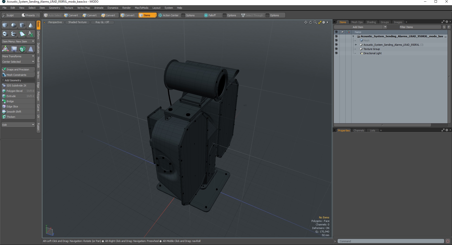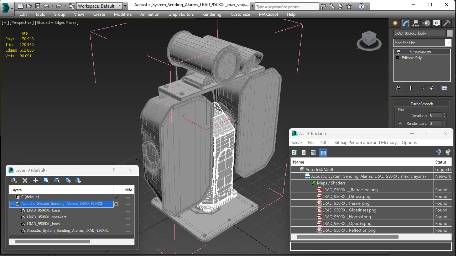 Acoustic System Sending Alarms LRAD 950RXL is a high quality, photo real 3d model that will enhance detail and realism to any of your rendering projects. The model has a fully textured, detailed design that allows for close-up renders, and was originally modeled in 3ds Max 2020 and rendered with V-Ray. Renders have no postprocessing!