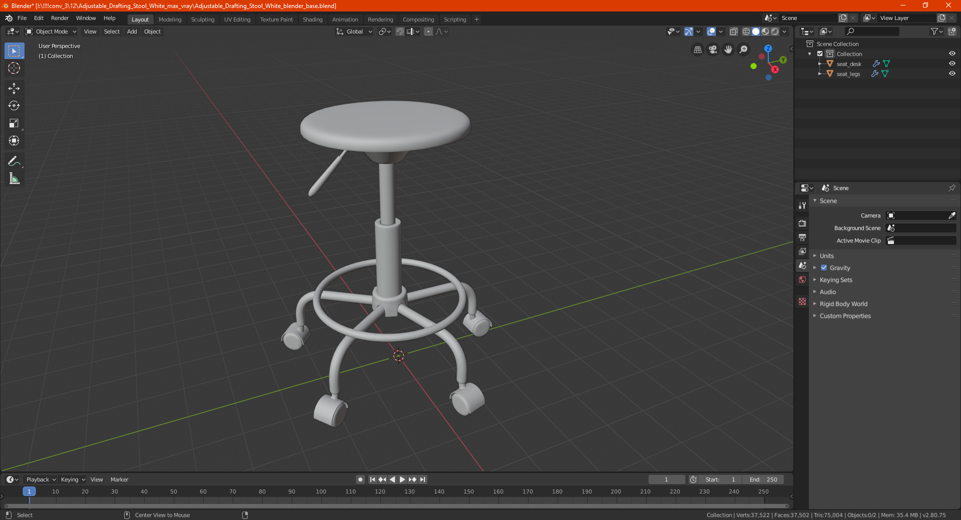 Adjustable Drafting Stool White is a high quality, photo real 3d model that will enhance detail and realism to any of your rendering projects. The model has a fully textured, detailed design that allows for close-up renders, and was originally modeled in 3ds Max 2020 and rendered with V-Ray. Renders have no postprocessing!