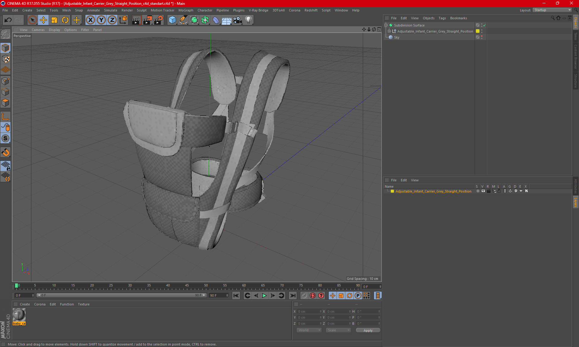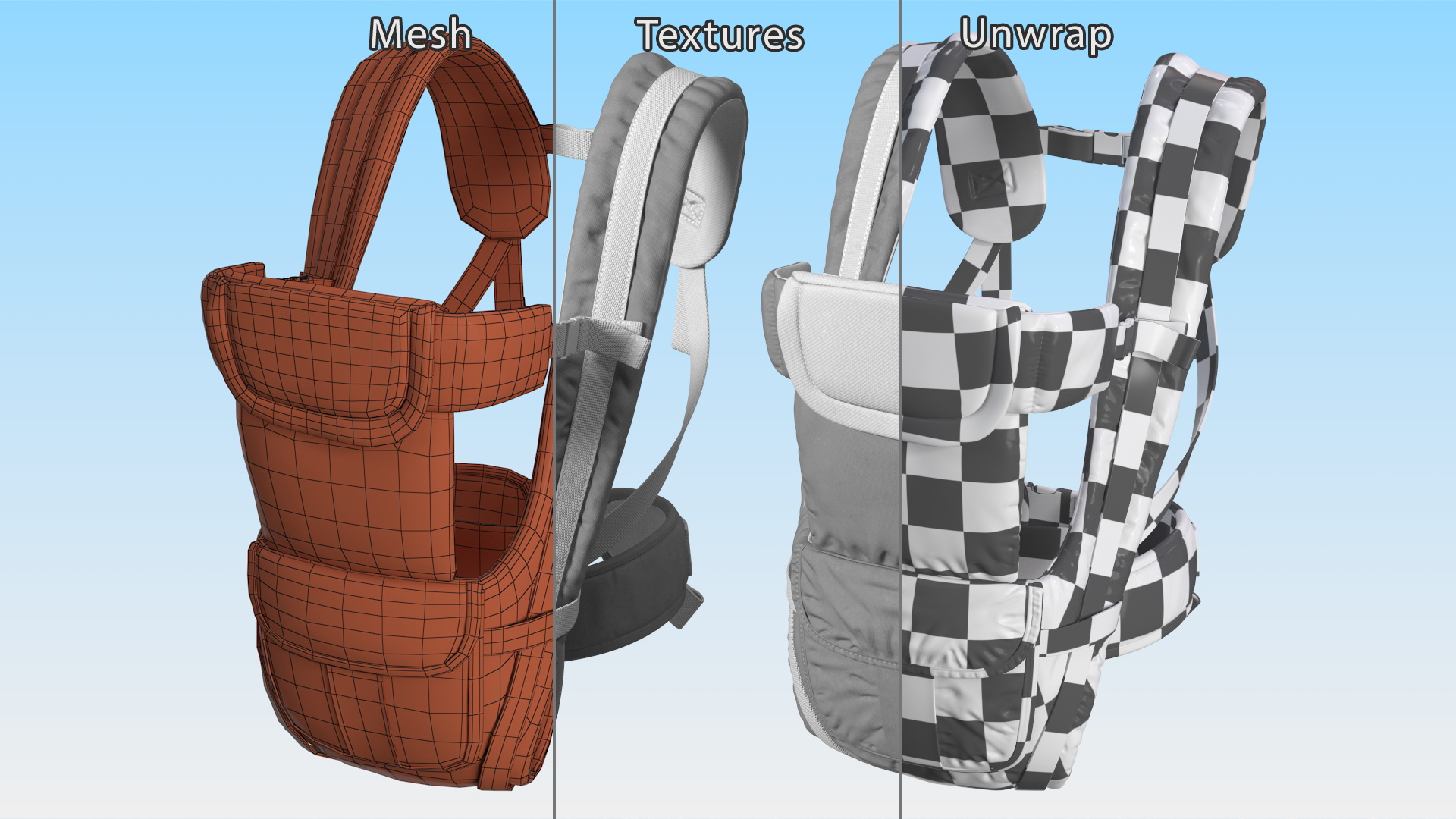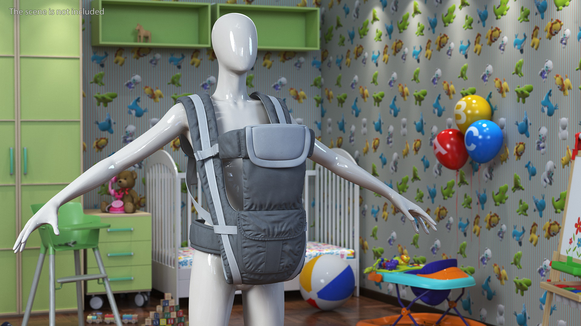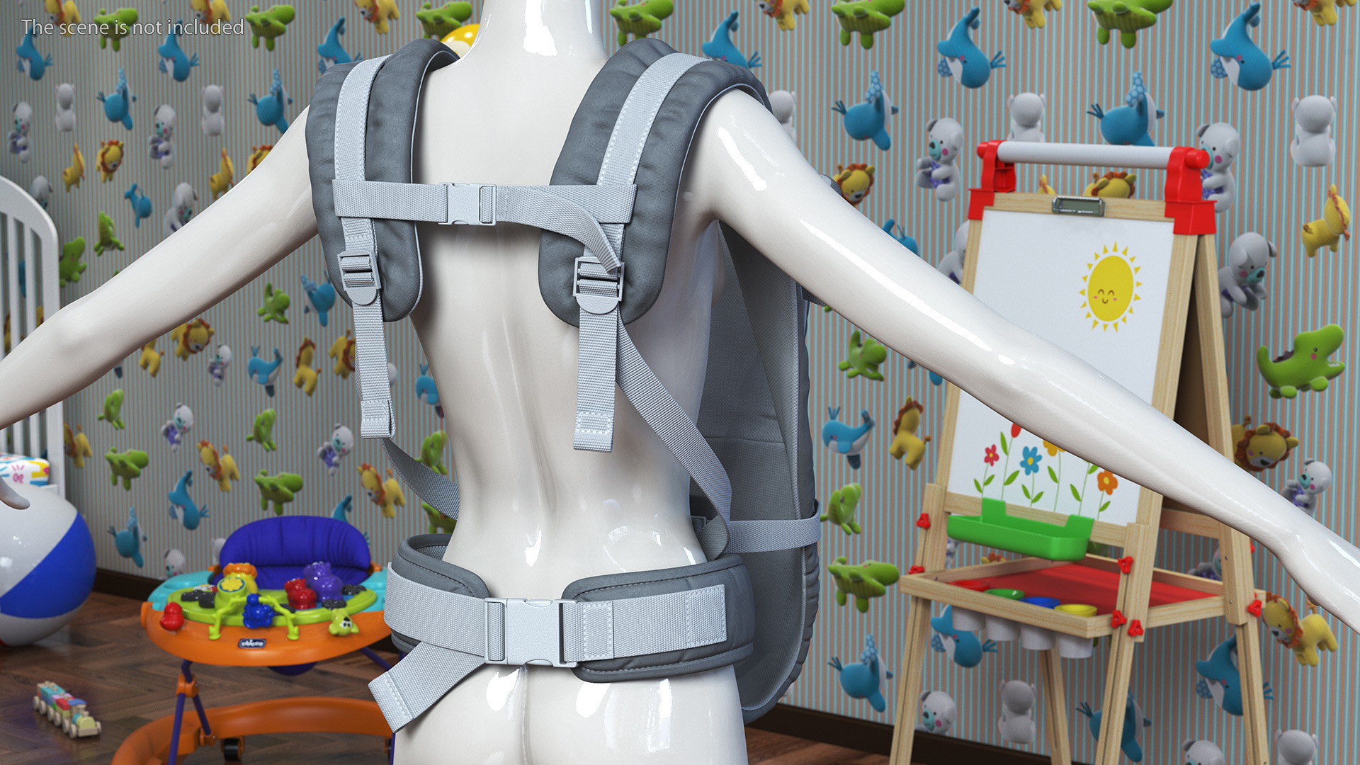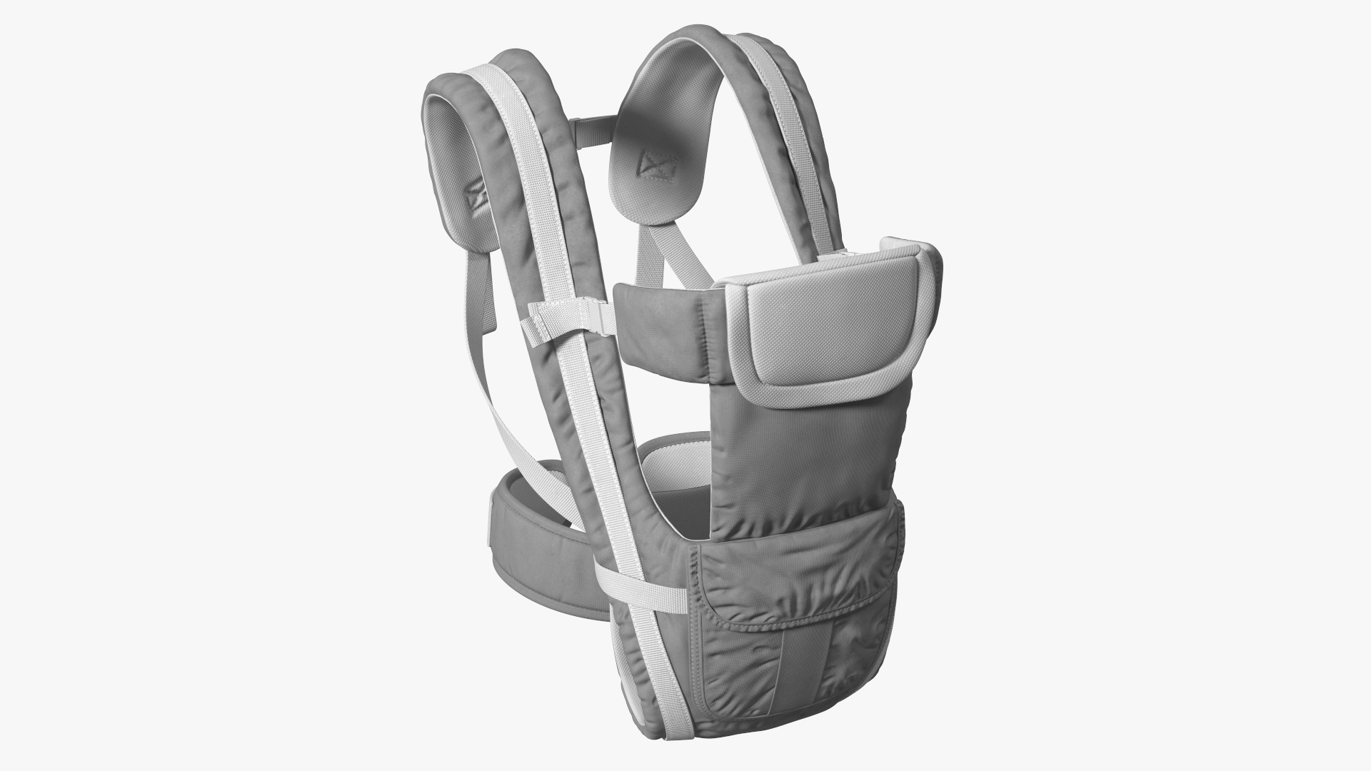 Adjustable Infant Carrier Grey Straight Position is a three-dimensional model of modern adjustable infant carrier, often referred to as a babycarrier, baby sling, kangaroo, baby backpack or babywearer, which is a specialized baby-carrying device.