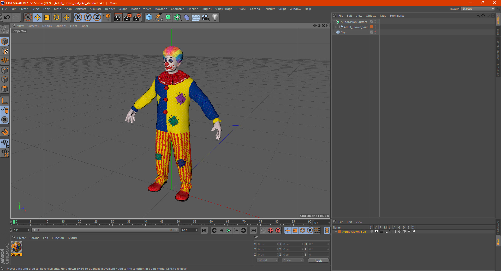 Adult Clown Suit is a high quality, photo real 3d model that will enhance detail and realism to any of your rendering projects. The model has a fully textured, detailed design that allows for close-up renders, and was originally modeled in 3ds Max 2020 and rendered with V-Ray. Renders have no postprocessing!