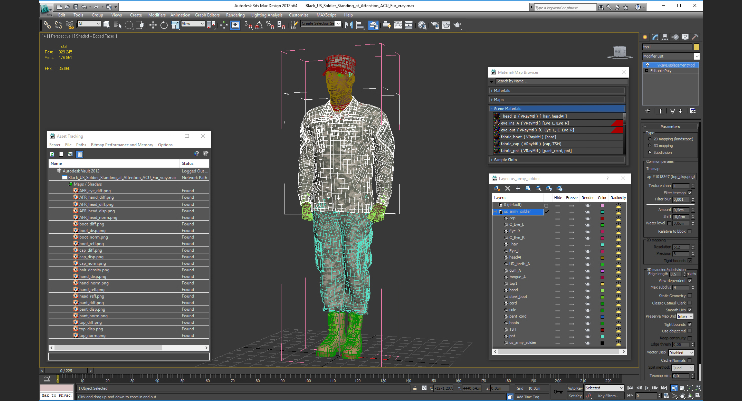 African American US Soldier Standing at Attention ACU Fur is a high quality, photo real 3d model that will enhance detail and realism to any of your rendering projects. The model has a fully textured, detailed design that allows for close-up renders, and was originally modeled in 3ds Max 2020 and rendered with V-Ray. Renders have no postprocessing!