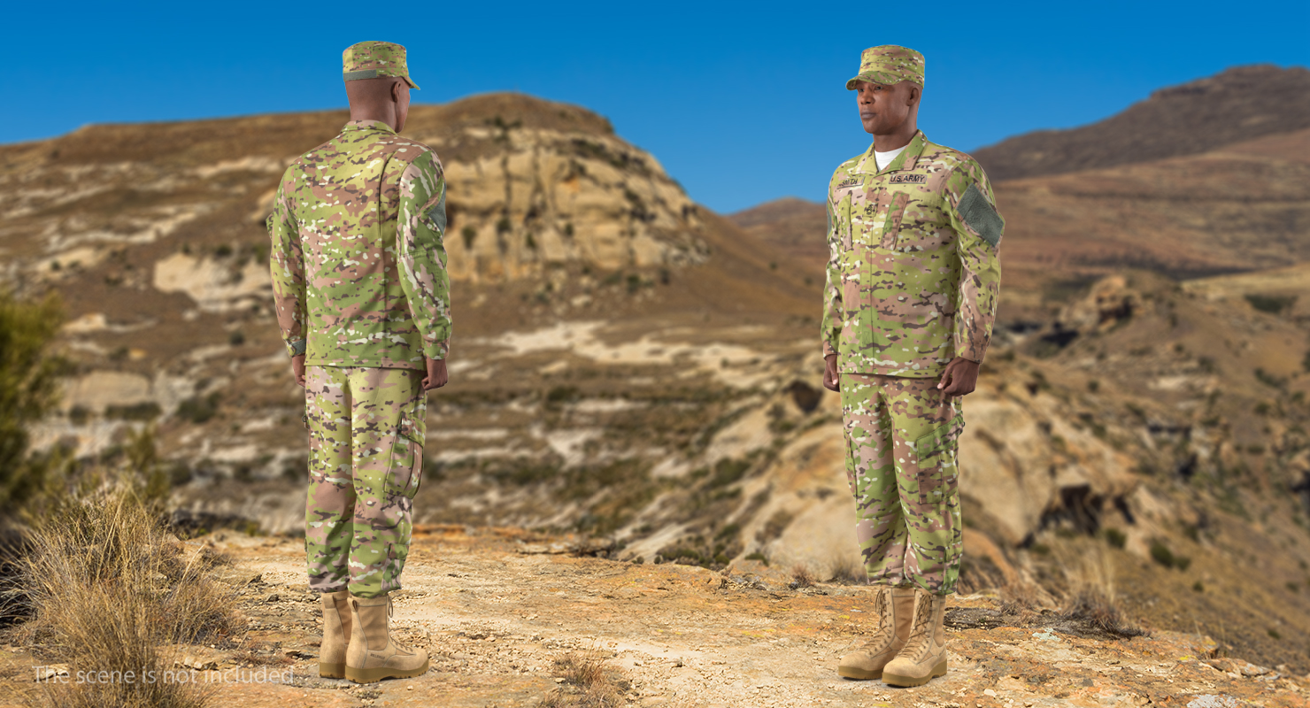 African-American US Soldier Standing at Attention Camouflage is a high quality, photo real 3d model that will enhance detail and realism to any of your rendering projects. The model has a fully textured, detailed design that allows for close-up renders, and was originally modeled in 3ds Max 2020 and rendered with V-Ray. Renders have no postprocessing!
