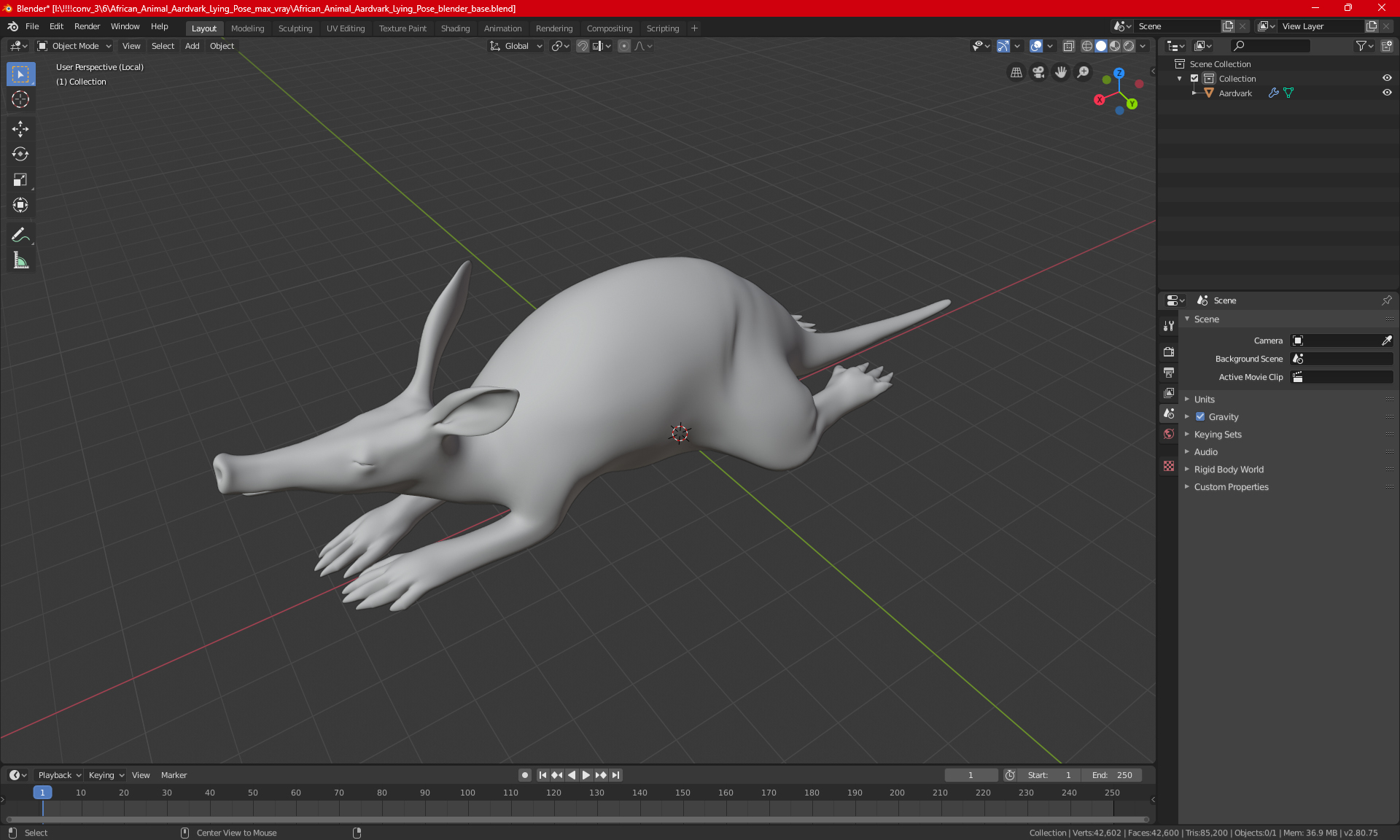 African Animal Aardvark Lying Pose is a three-dimensional model of aardvark (Orycteropus afer, anteater, African ant bear, or Cape anteater), which is an medium-sized, African, burrowing, nocturnal, mammal animal with a long snout, similar to that of a pig, which is used to sniff out food.