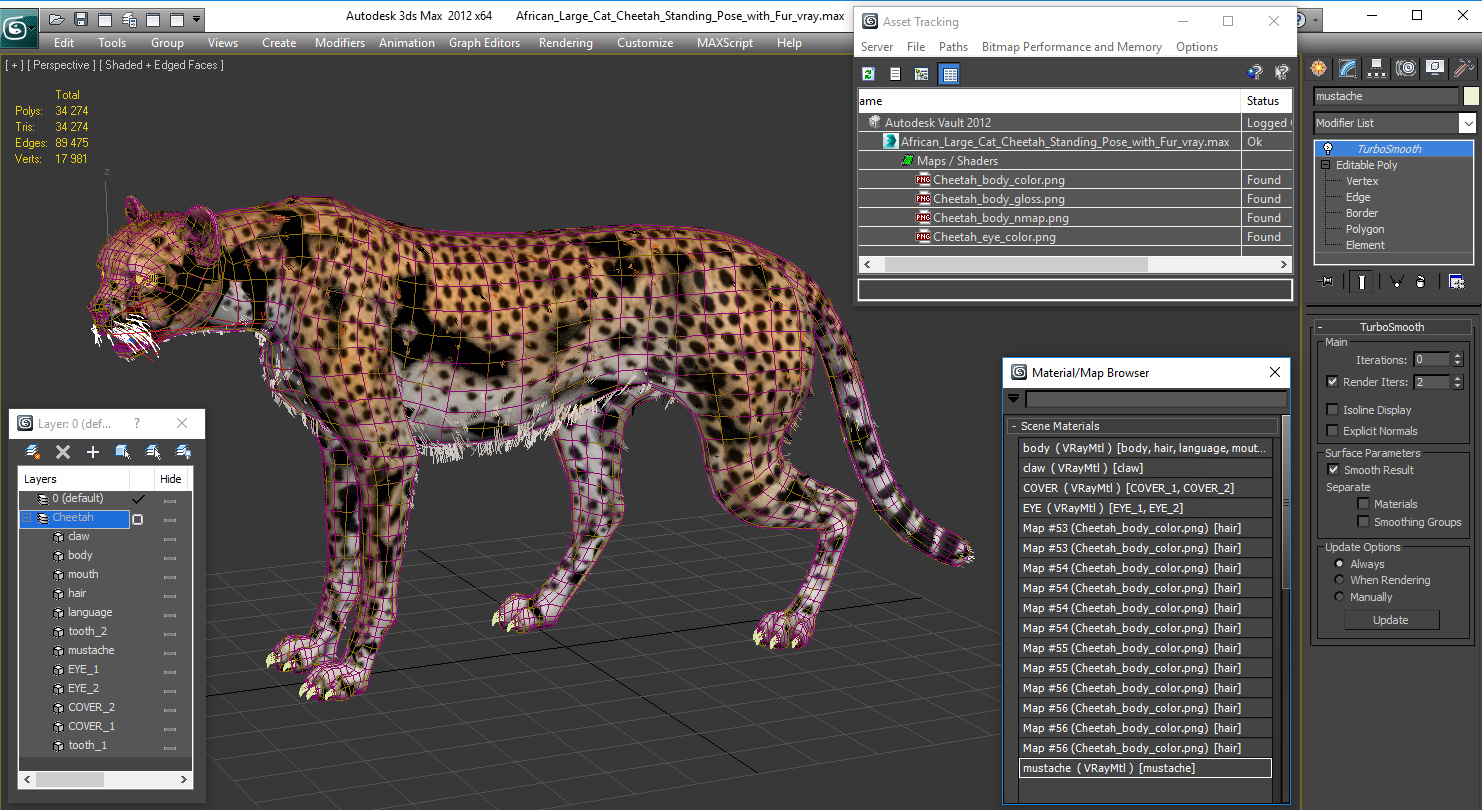 African Large Cat Cheetah Standing Pose with Fur has a 3dsmax Fur modifier, hair customizable (hair count, hair segments, hair color, root size, tip size, etc).