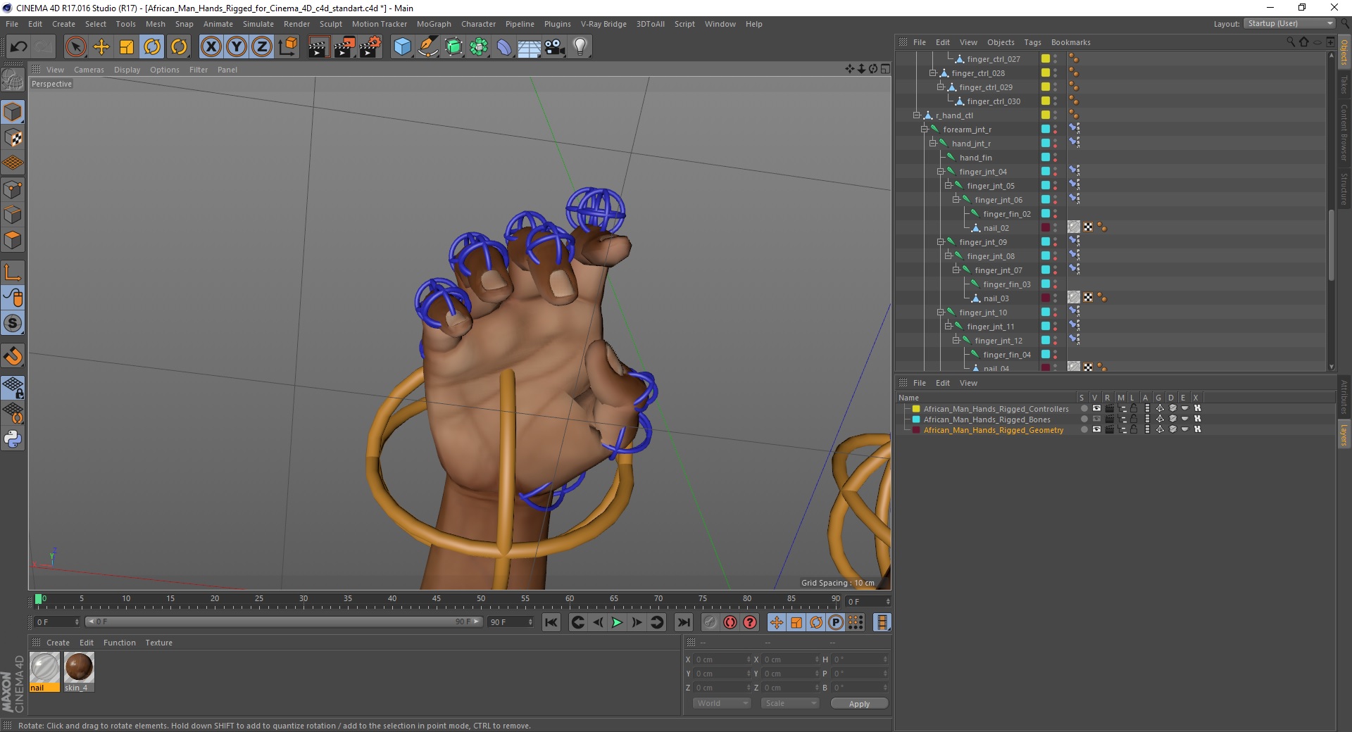 African Man Hands Rigged for Cinema 4D is fully rigged and is ready to be animated in Cinema 4D. You can easily position it the way you need or animate it the way your project requires. See the screenshots to get an idea of how rigging works. The pose of the model on the render images is an example and can be recreated using rig, it is not initially included into the product.
