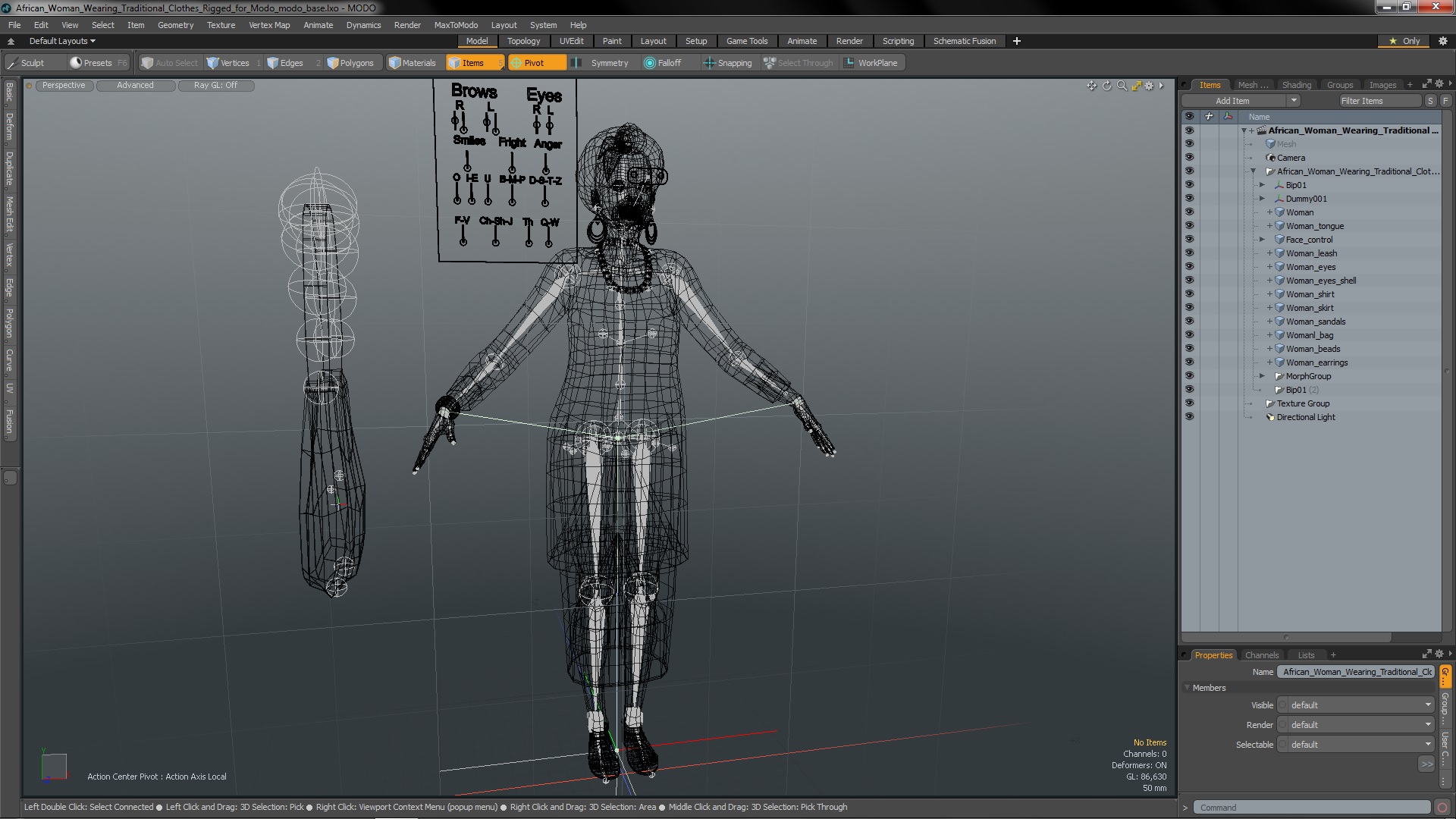 African Woman Wearing Traditional Clothes Rigged for Modo is fully rigged and is ready to be animated. You can easily position it the way you need or animate it the way your project requires using helpers in 3D Studio Max. See the turntable to get an idea of how rigging works.