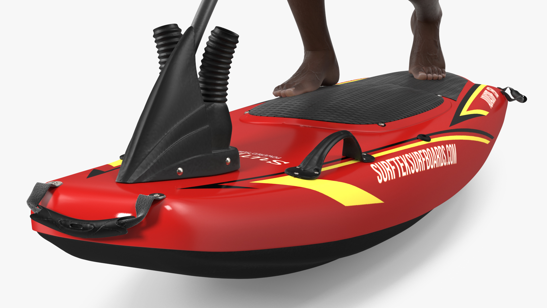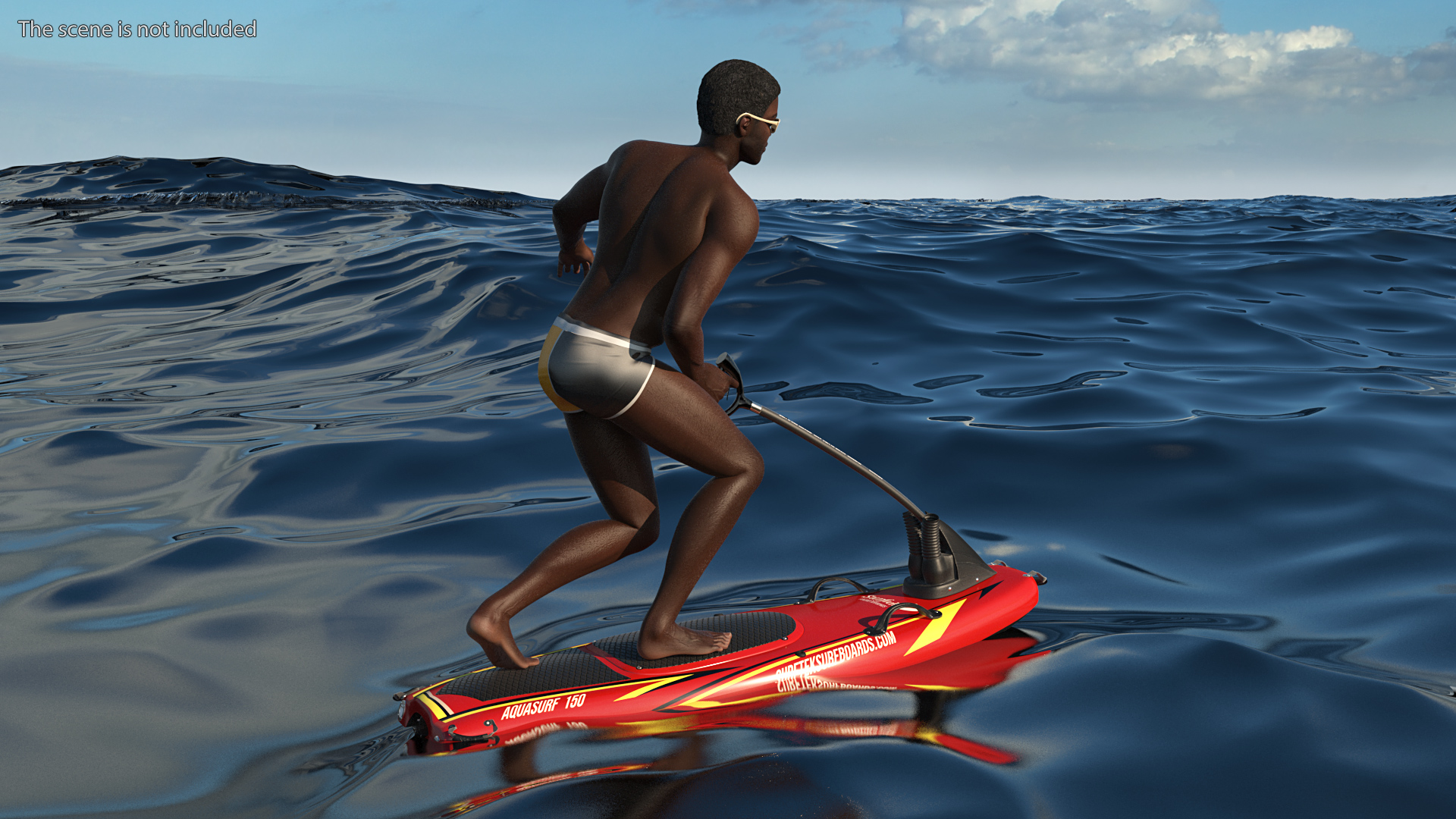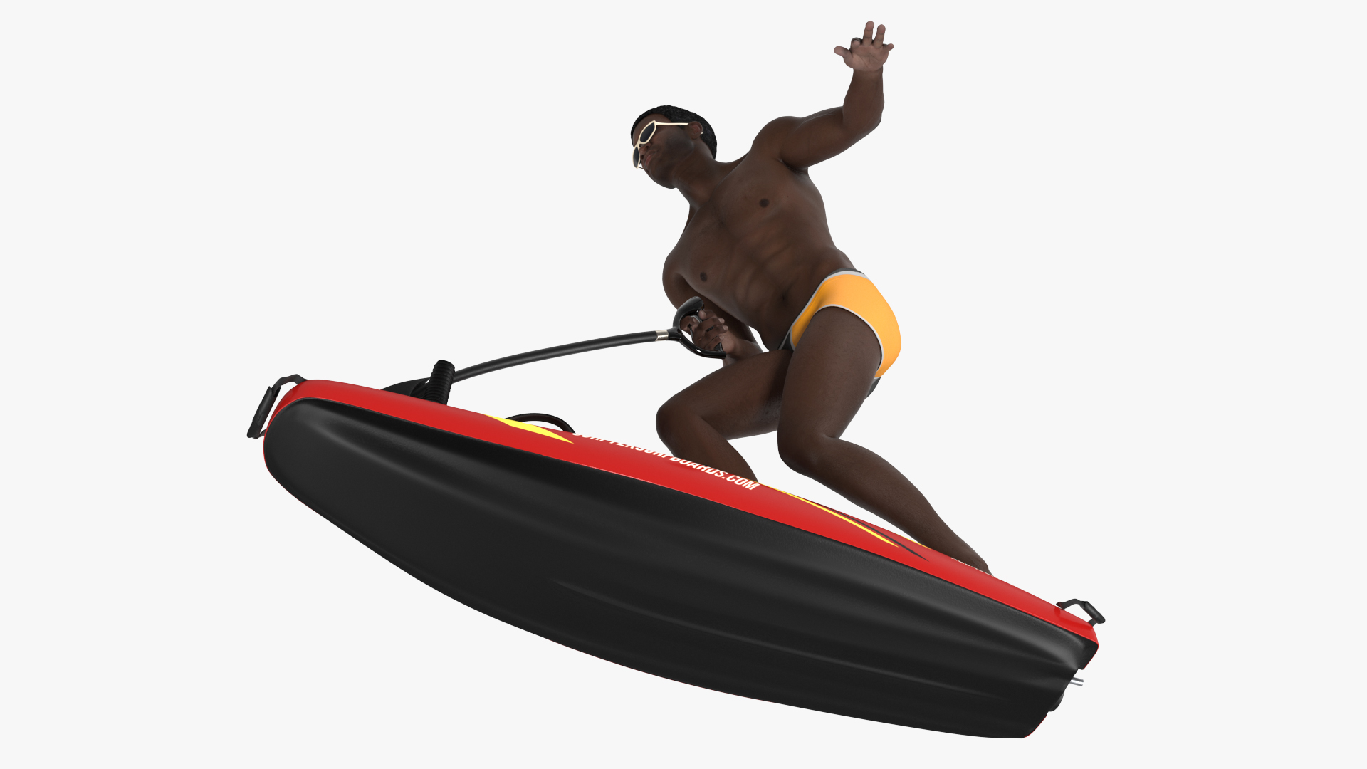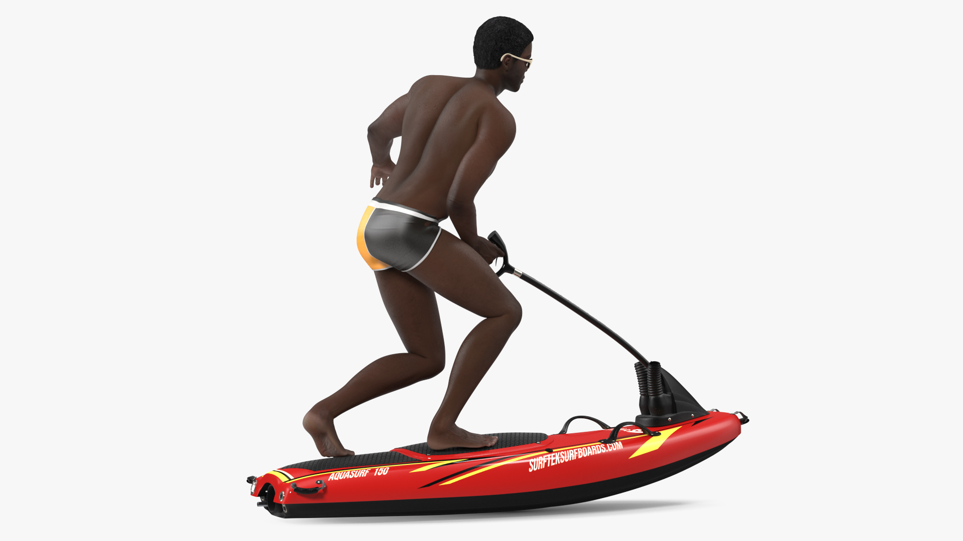 Afro American Man with Surftek Aquasurf Jet Surfboard Rigged is a three-dimensional model of a brave athlete with jet-powered surfboard which used for water sports.