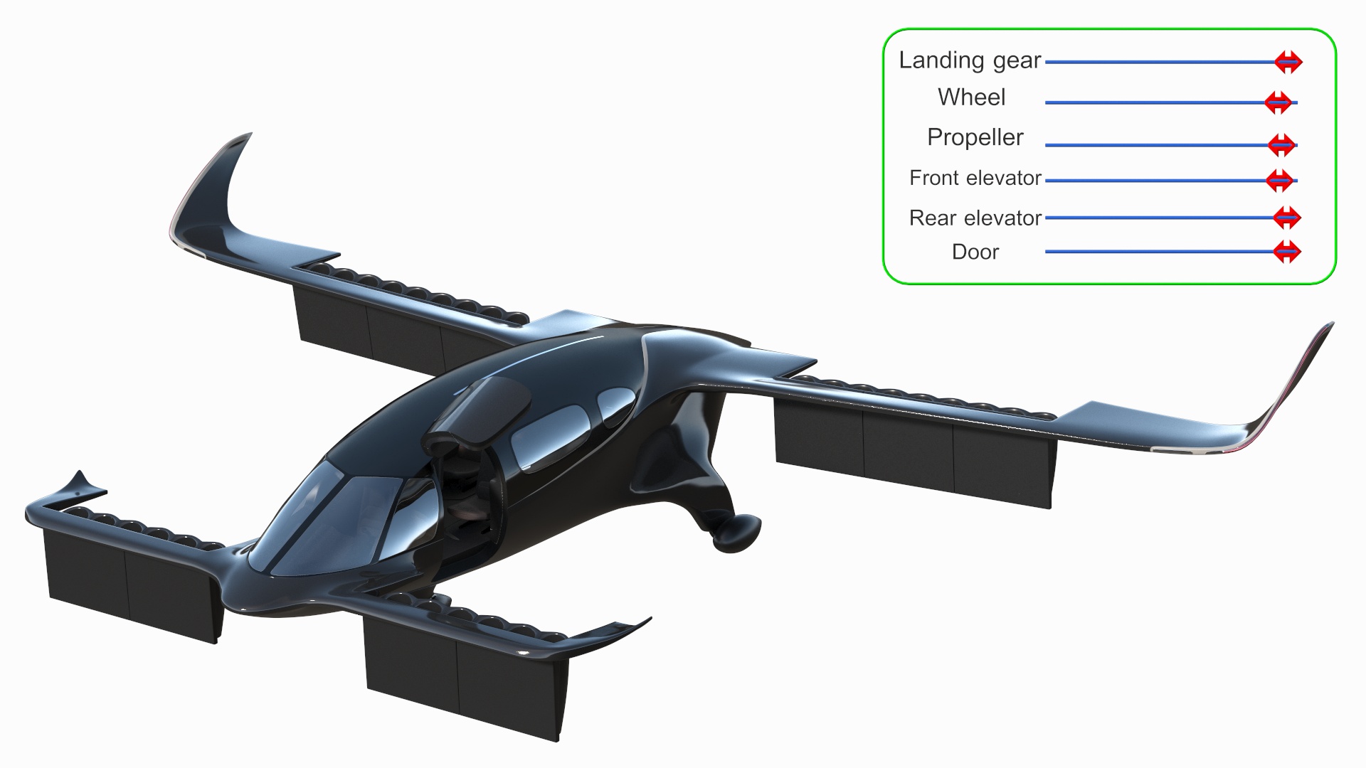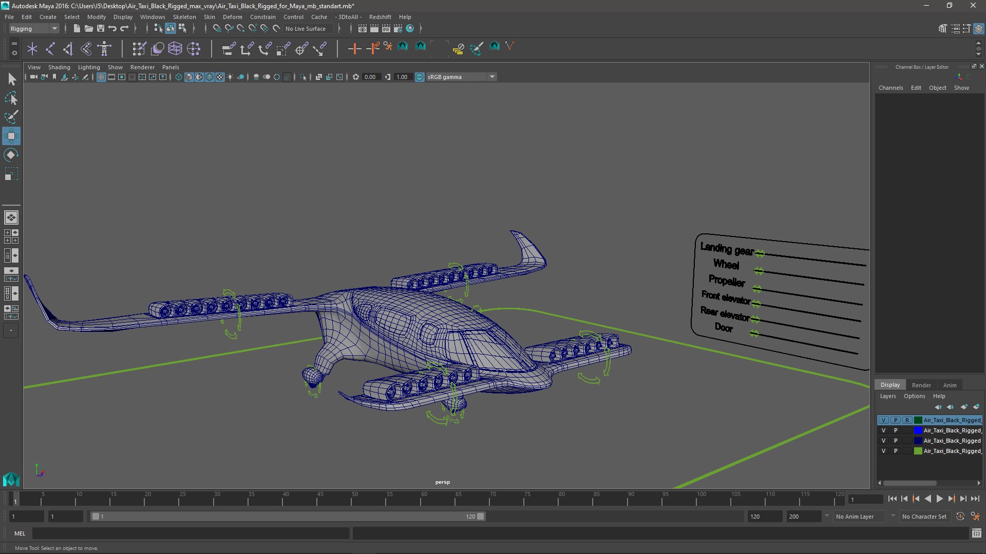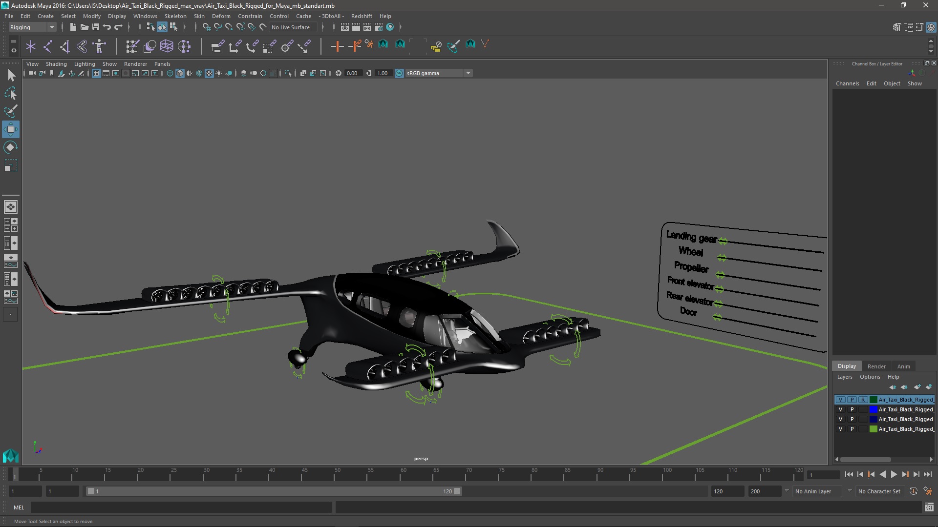 Air Taxi Black Rigged for Maya is fully rigged and is ready to be animated in Maya. You can easily position it the way you need or animate it the way your project requires. See the screenshots to get an idea of how rigging works. The pose of the model on the render images is an example and can be recreated using rig, it is not initially included into the product.