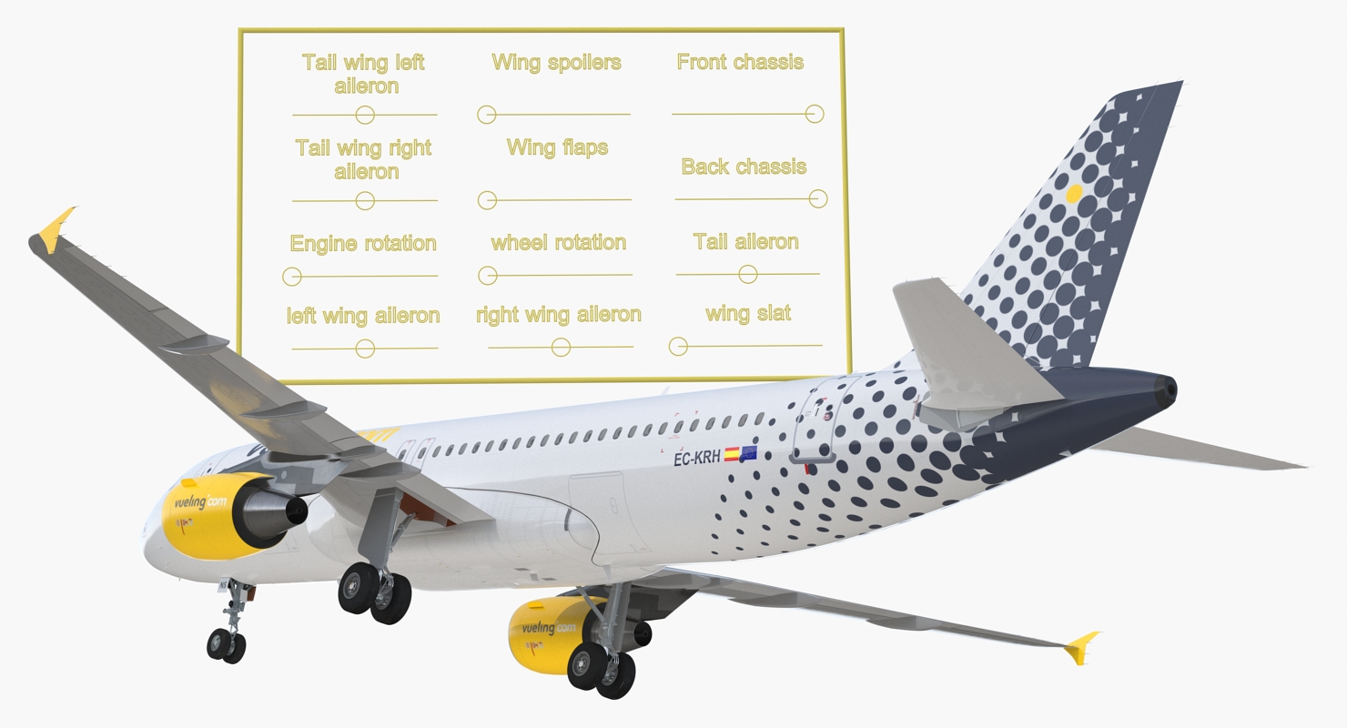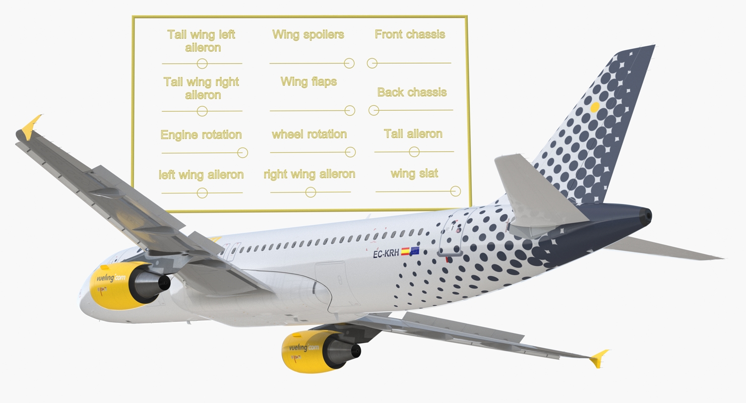 Airbus A320 Vueling Airlines Rigged is fully rigged and is ready to be animated. You can easily position it the way you need or animate it the way your project requires using helpers in 3D Studio Max. See the turntable to get an idea of how rigging works.