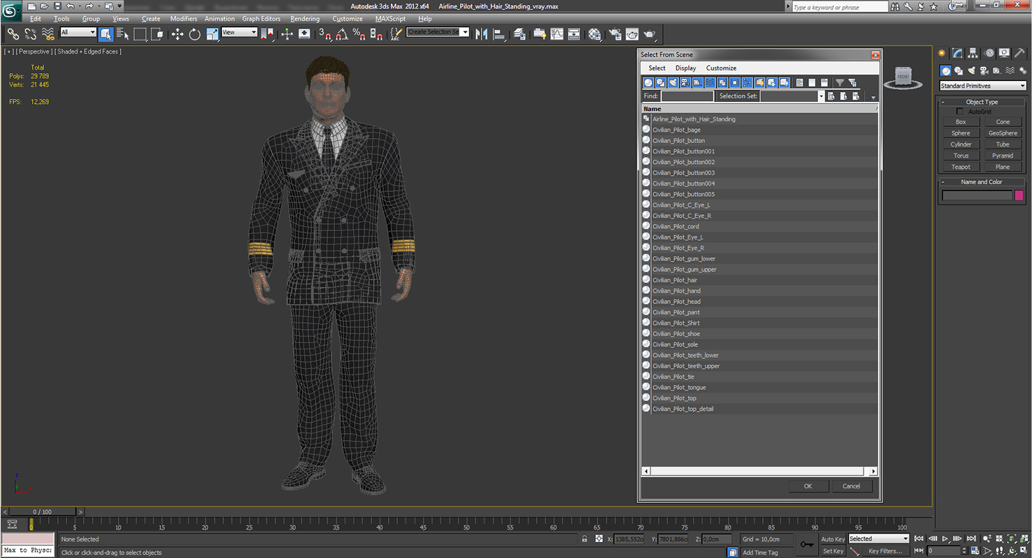 Airline Pilot with Fur Standing has a 3dsmax Fur modifier, hair customizable (hair count, hair segments, hair color, root size, tip size, etc).