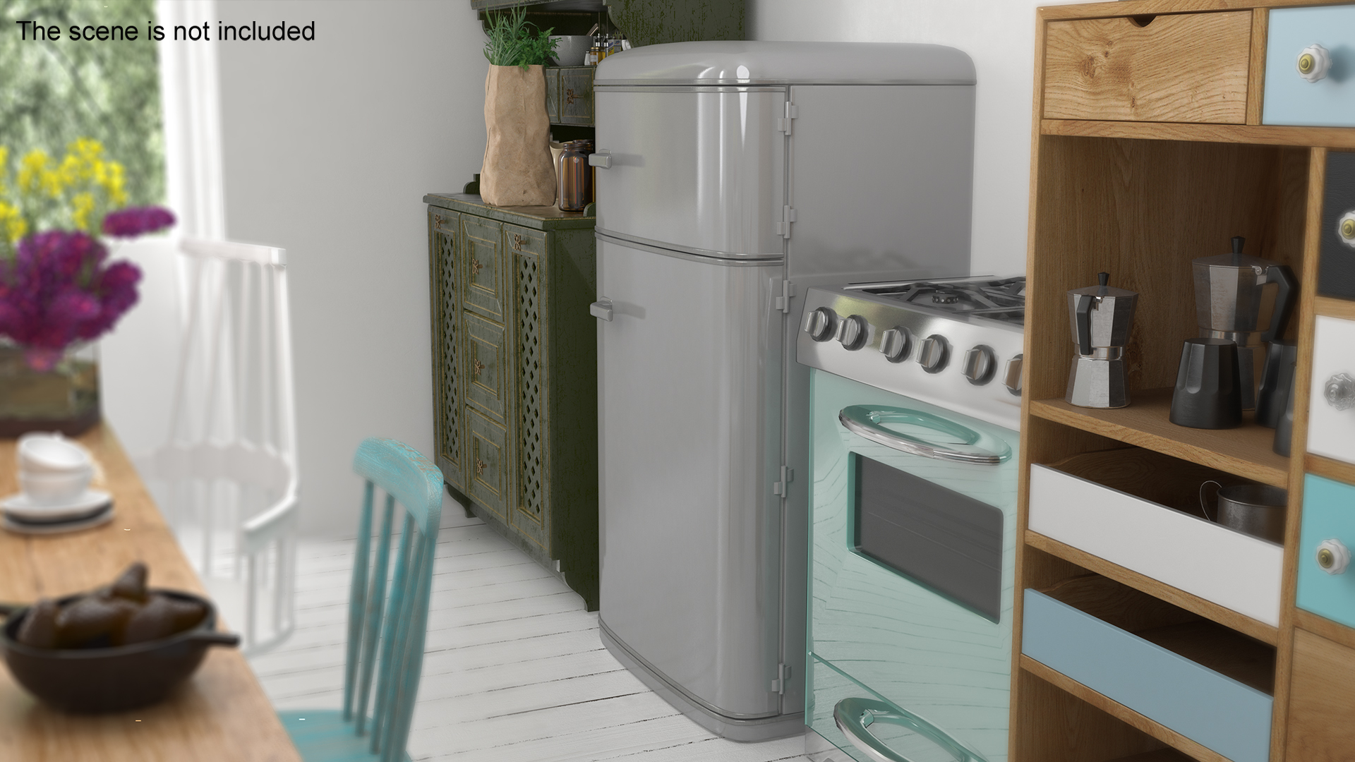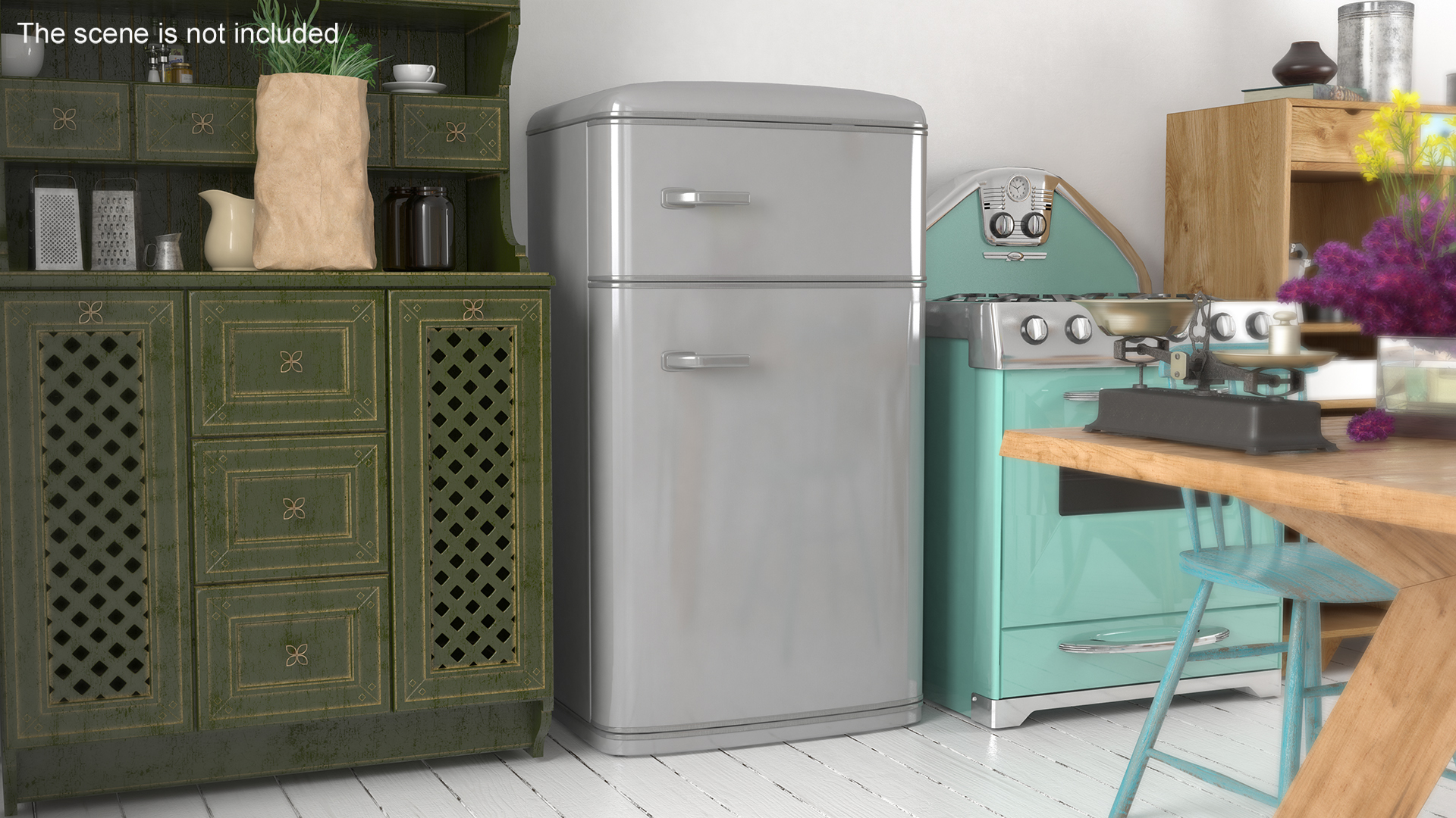 Aluminium Retro Fridge with Top Freezer is a three-dimensional model of retro home fridge with a top mount freezer, which is a vintage style refrigerator with mid-20th century design.
