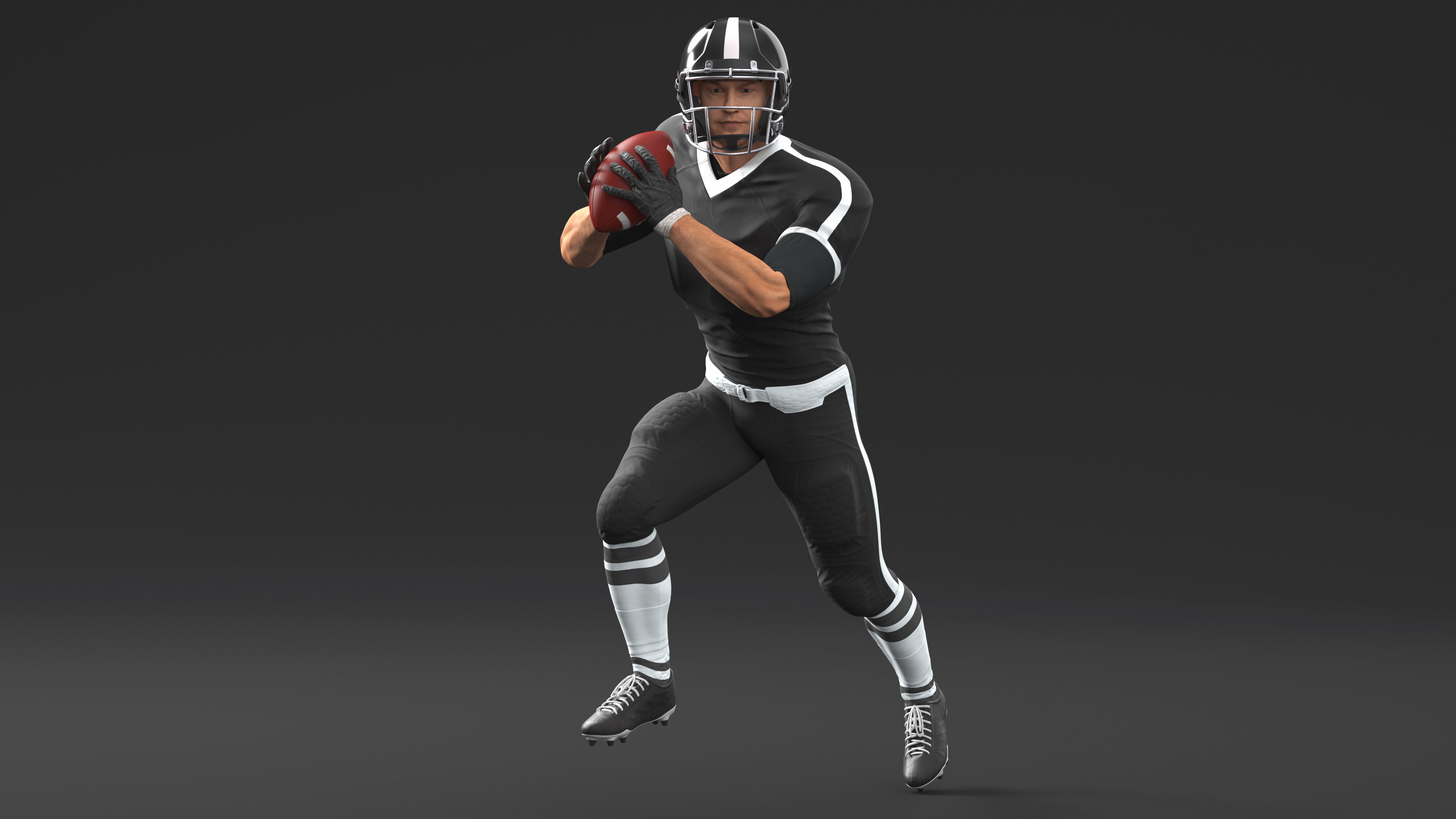 American Football Player Black Uniform Running The Ball is a high quality, photo real 3d model that will enhance detail and realism to any of your rendering projects. The model has a fully textured, detailed design that allows for close-up renders, and was originally modeled in 3ds Max 2020 and rendered with V-Ray. Renders have no postprocessing!