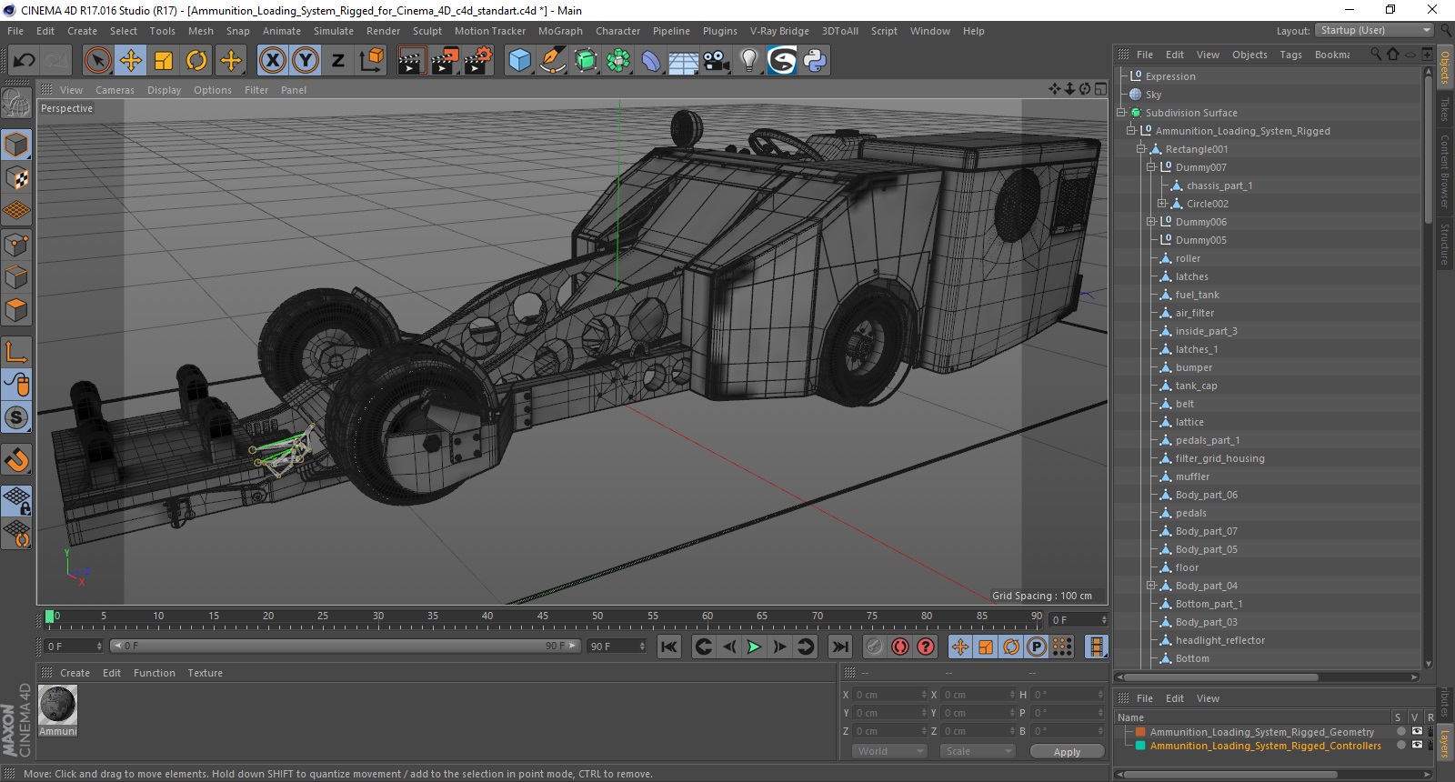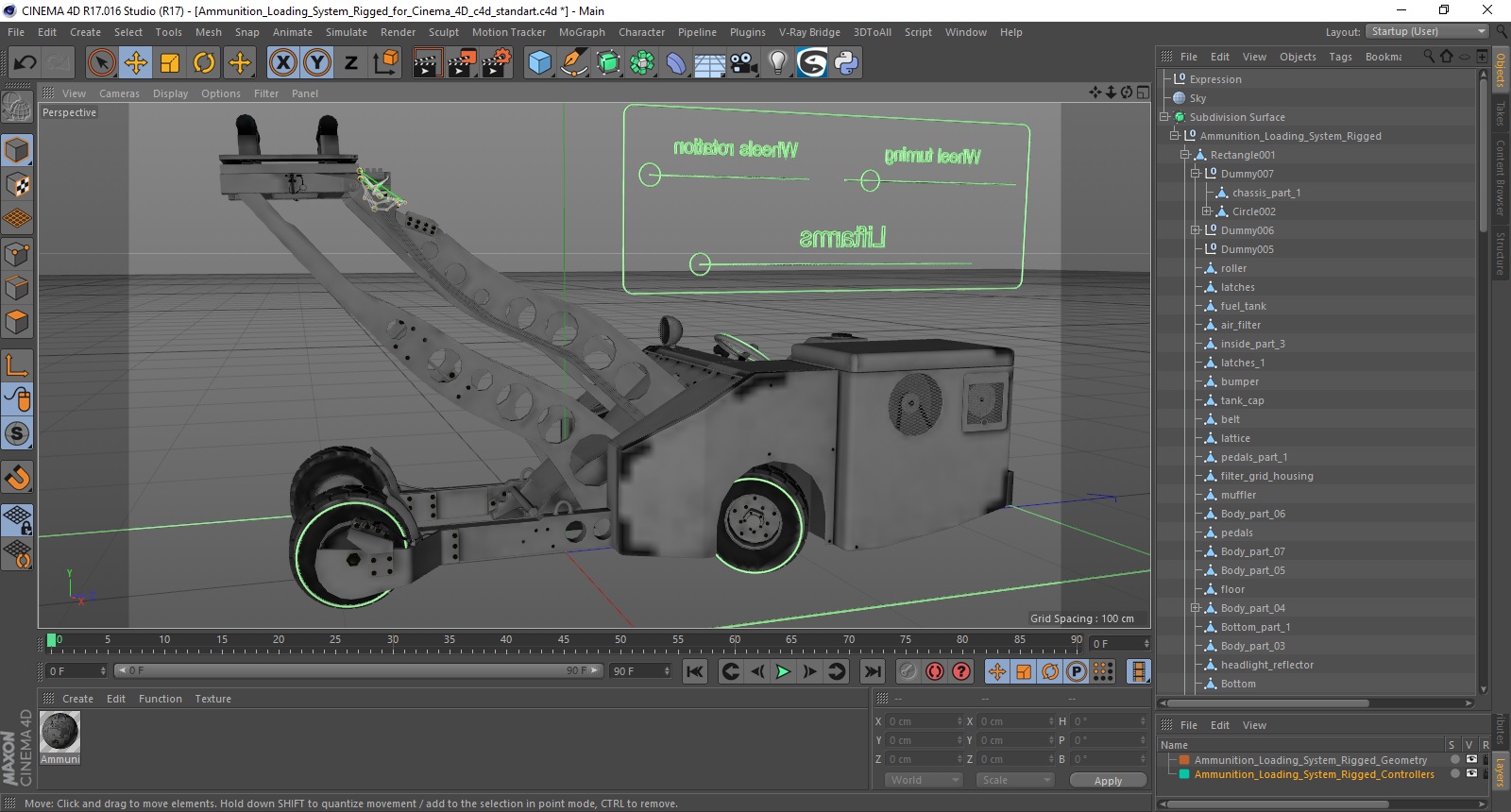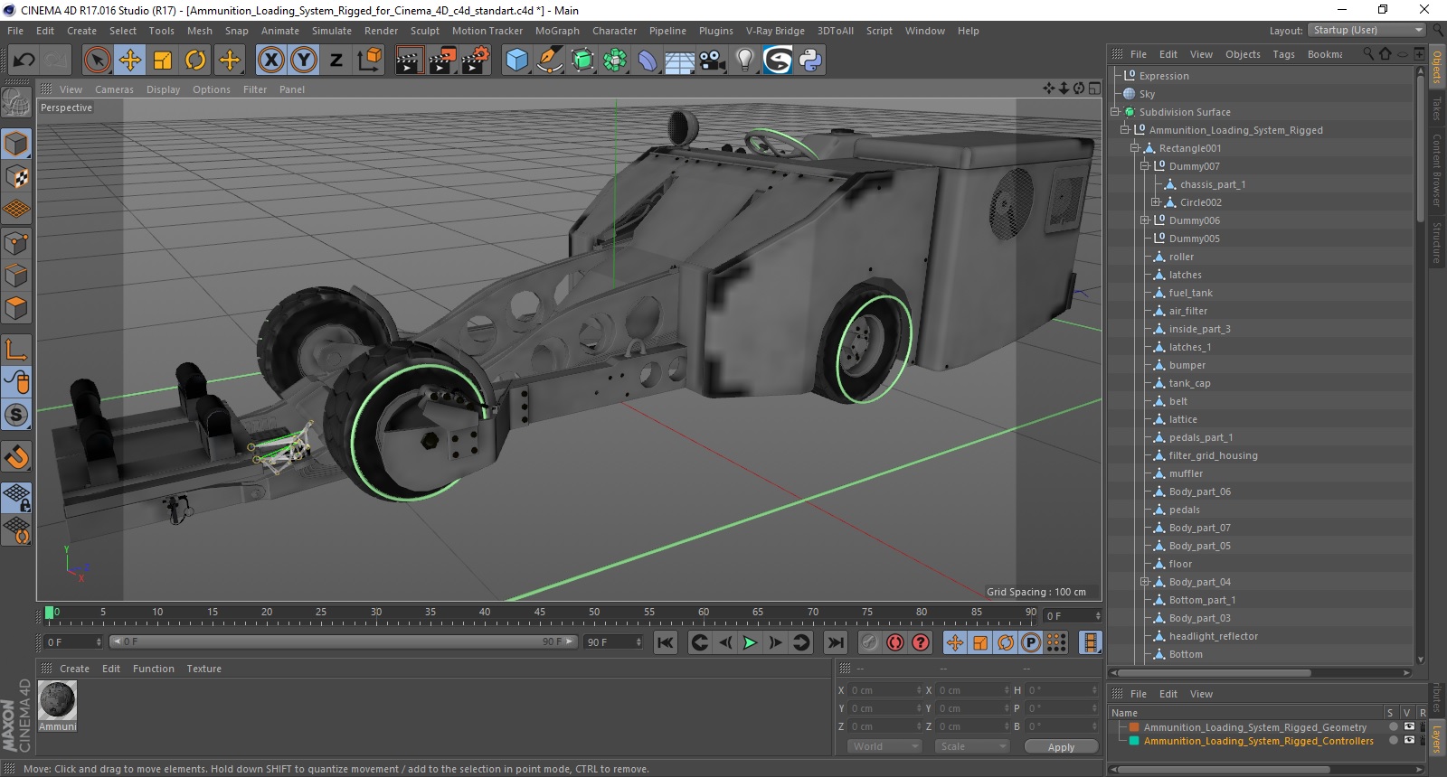 Ammunition Loading System Rigged for Cinema 4D is fully rigged and is ready to be animated in Cinema 4D. You can easily position it the way you need or animate it the way your project requires. See the screenshots to get an idea of how rigging works. The pose of the model on the render images is an example and can be recreated using rig, it is not initially included into the product.