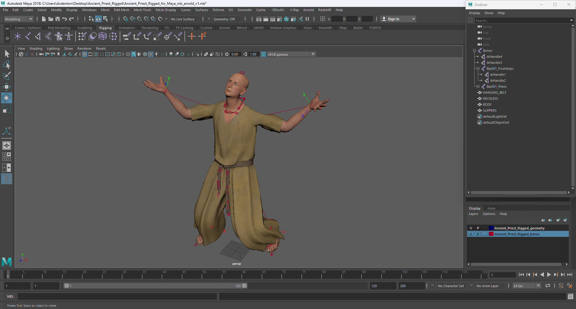Ancient Priest Rigged for Maya is fully rigged and is ready to be animated in Maya. You can easily position it the way you need or animate it the way your project requires. See the screenshots to get an idea of how rigging works. The pose of the model on the render images is an example and can be recreated using rig, it is not initially included into the product.