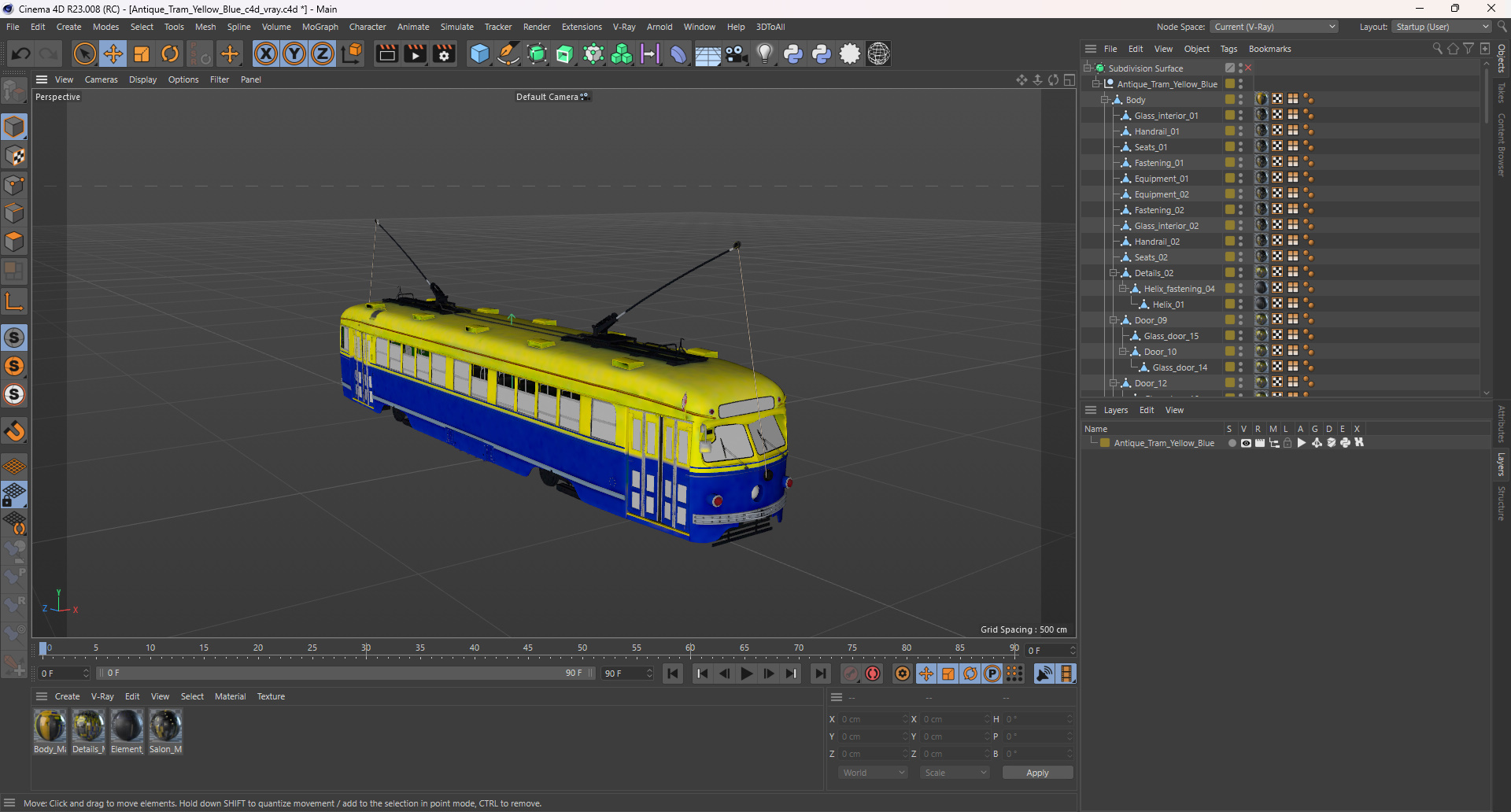 Antique Tram Yellow Blue is a high quality, photo real 3d model that will enhance detail and realism to any of your rendering projects. The model has a fully textured, detailed design that allows for close-up renders, and was originally modeled in 3ds Max 2020 and rendered with V-Ray. Renders have no postprocessing!