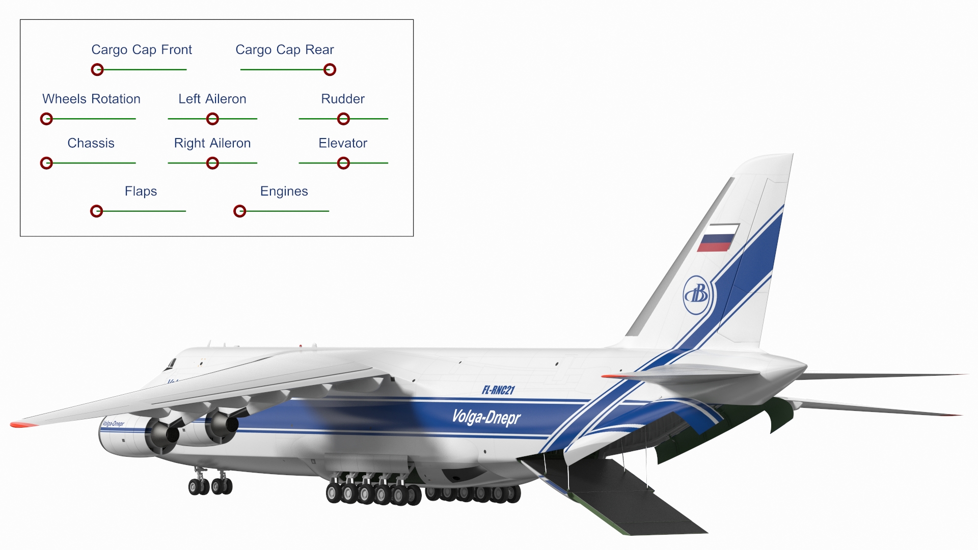 Antonov An124 Ruslan Aircraft Volga Dnepr Rigged is fully rigged and is ready to be animated. You can easily position it the way you need or animate it the way your project requires using helpers in 3D Studio Max. See the turntable to get an idea of how rigging works.