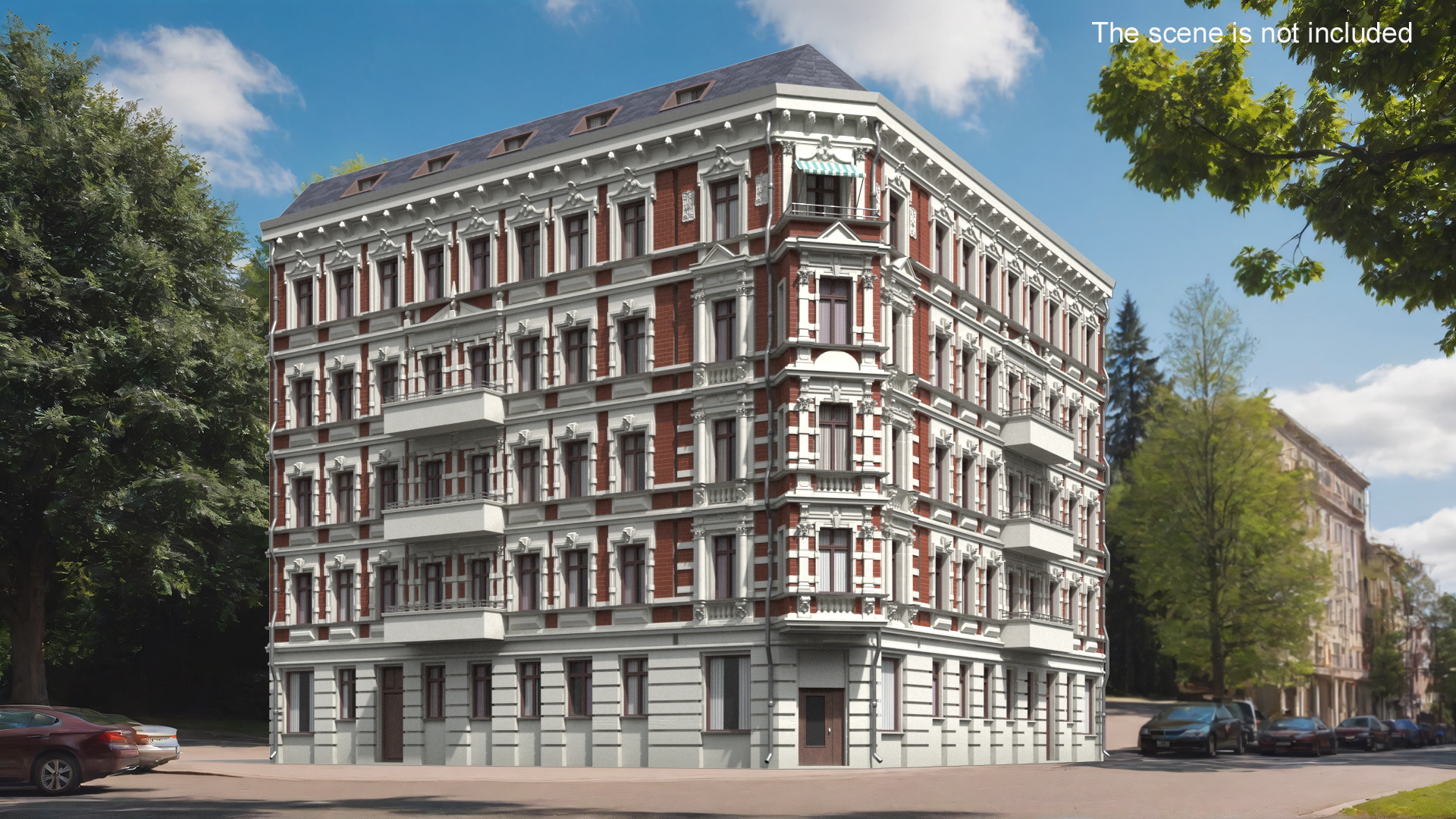 Apartments Building in Berlin is a three-dimensional model of Germany style (Berlin German style) architecture specimen that is defined by its elegant style buildings from the 19th century, characterized by uniform facades, wrought-iron balconies, and mansard roofs.