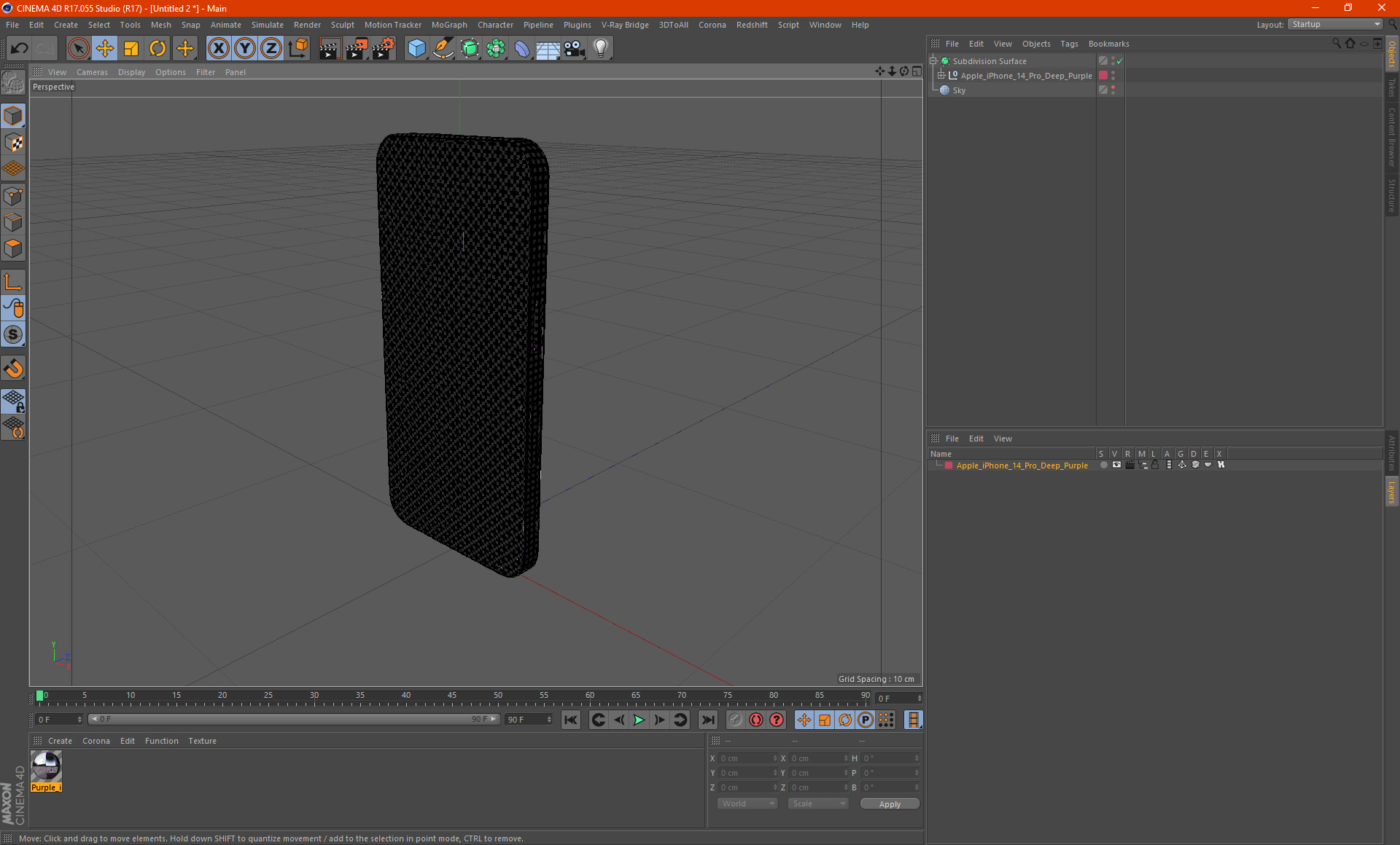 Apple iPhone 14 Pro Deep Purple is a high quality, photo real 3d model that will enhance detail and realism to any of your rendering projects. The model has a fully textured, detailed design that allows for close-up renders, and was originally modeled in 3ds Max 2020 and rendered with V-Ray. Renders have no postprocessing!
