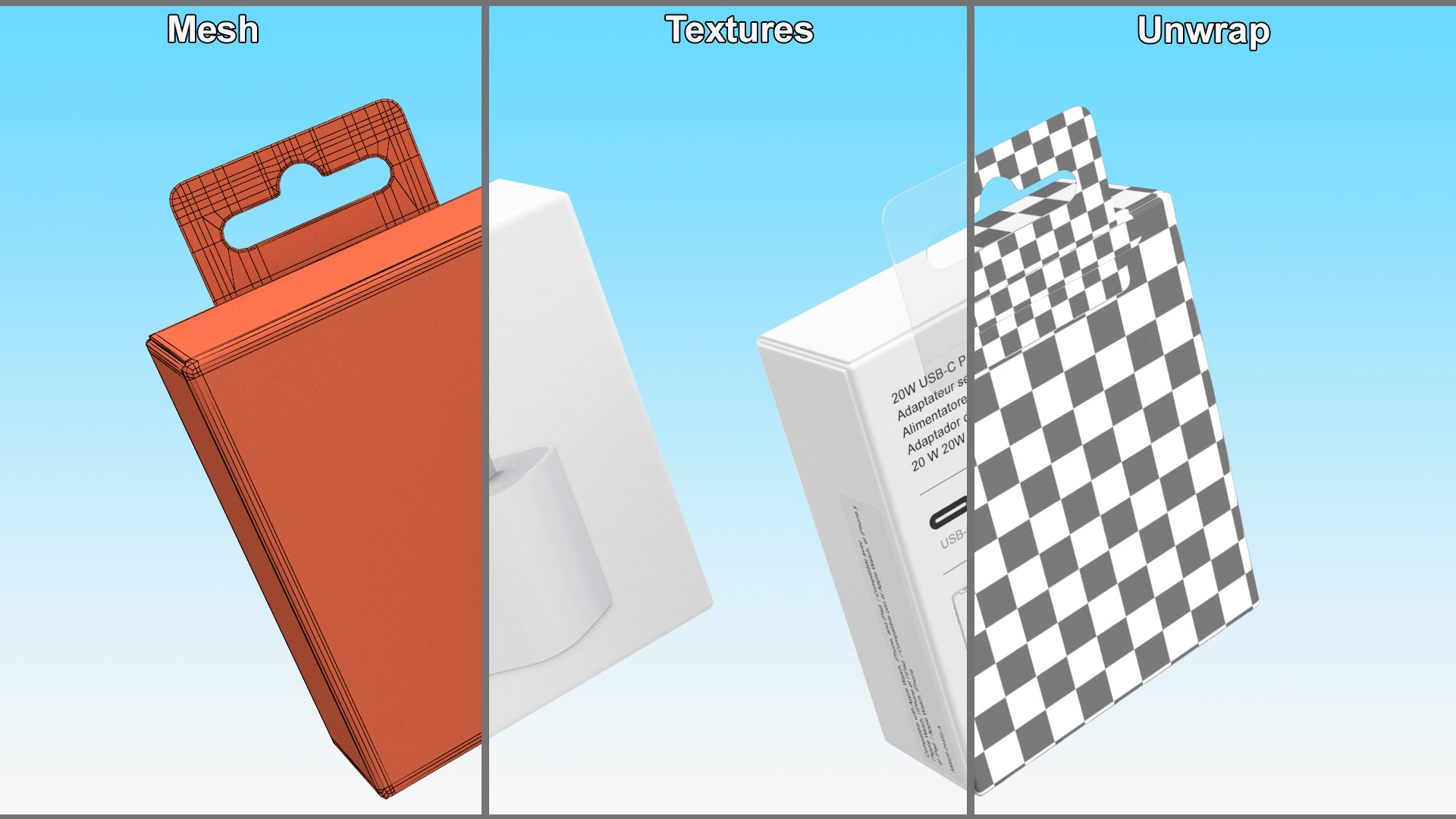 Apple USB-C Power Adapter Retail Packaging is a high quality, photo real 3d model that will enhance detail and realism to any of your rendering projects. The model has a fully textured, detailed design that allows for close-up renders, and was originally modeled in 3ds Max 2020 and rendered with V-Ray. Renders have no postprocessing!