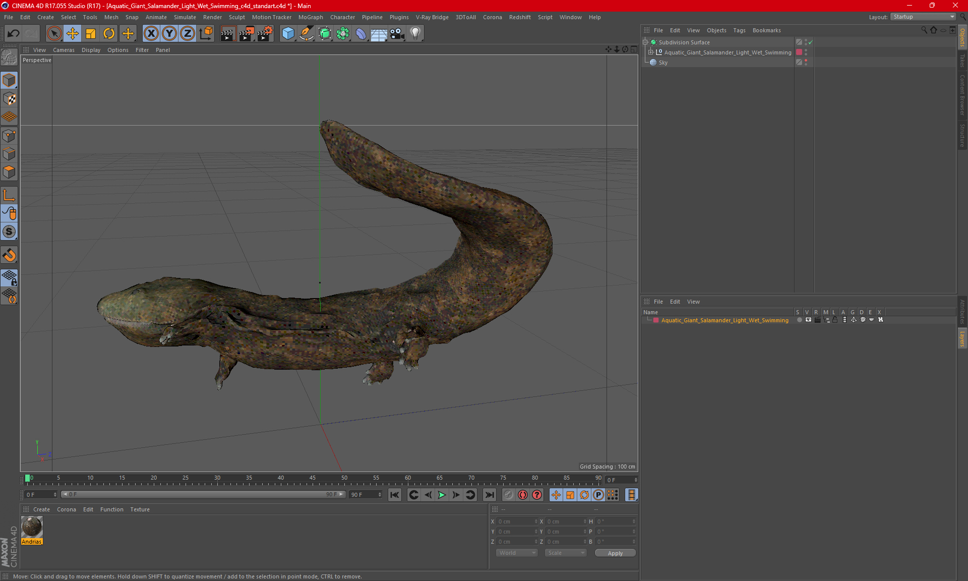 Aquatic Giant Salamander Light Wet Swimming is a high quality, photo real 3d model that will enhance detail and realism to any of your rendering projects. The model has a fully textured, detailed design that allows for close-up renders, and was originally modeled in 3ds Max 2020 and rendered with V-Ray. Renders have no postprocessing!