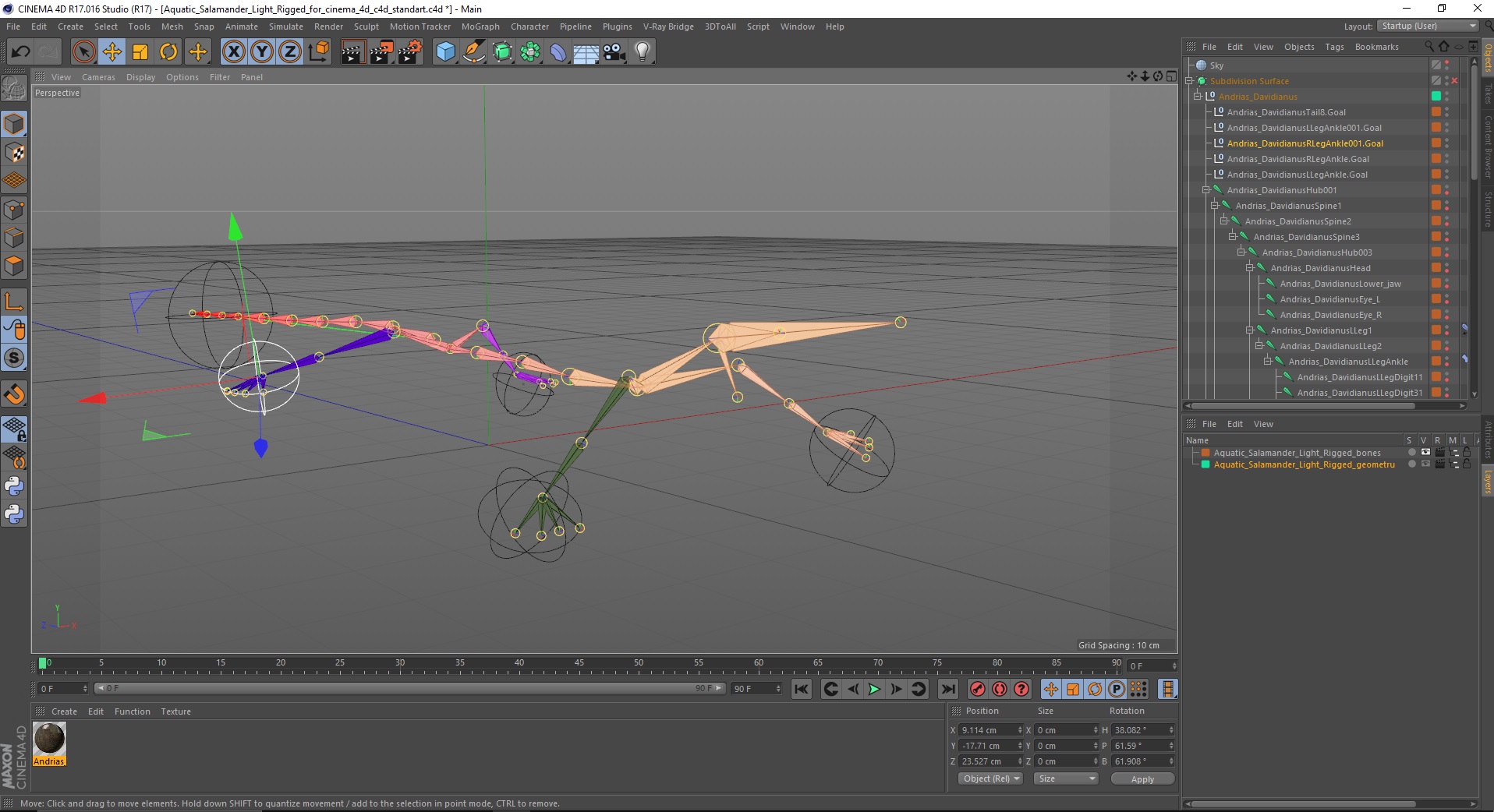 Aquatic Salamander Light Rigged for Cinema 4D is fully rigged and is ready to be animated in Cinema 4D. You can easily position it the way you need or animate it the way your project requires. See the screenshots to get an idea of how rigging works. The pose of the model on the render images is an example and can be recreated using rig, it is not initially included into the product.