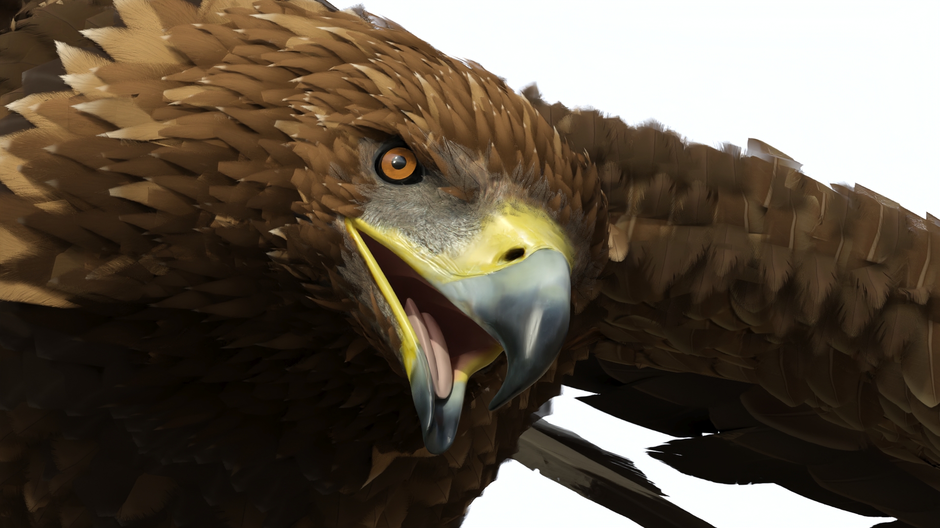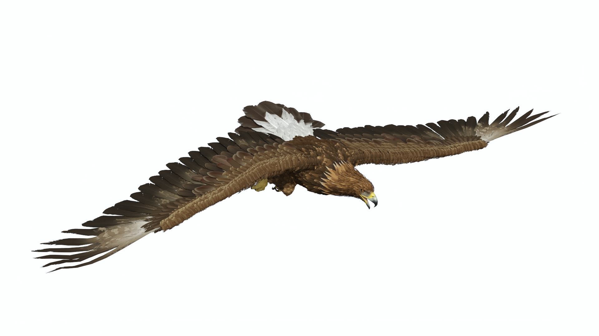 Aquila Chrysaetos Eagle Flying is a three-dimensional model of golden eagle (Aquila chrysaetos) that is one of North America's largest birds of prey, recognizable by its dark brown plumage and striking golden feathers on the back of its head and neck.