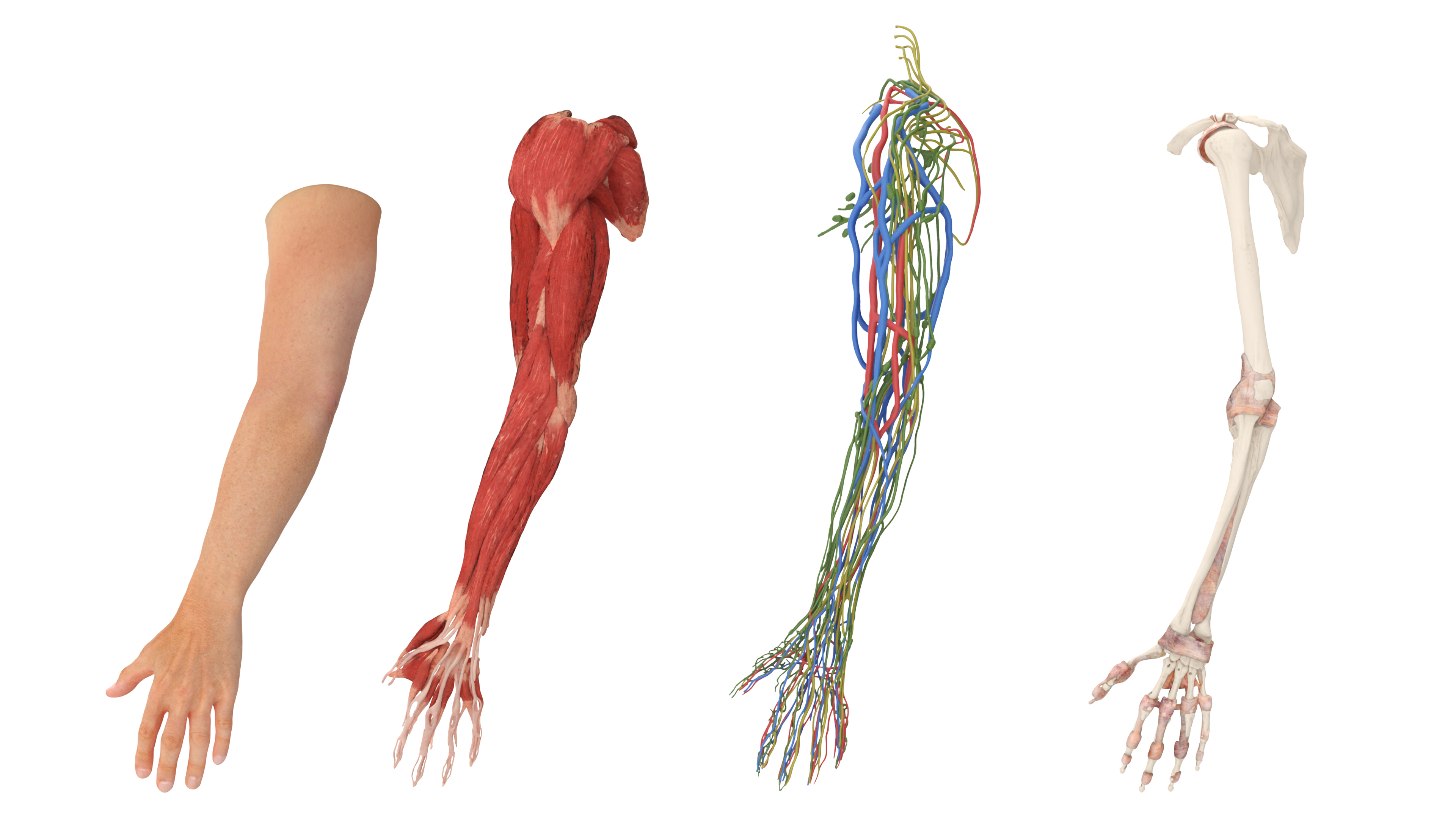 Human arm skeleton part of people framework bones structure. Human arm and hand part of human cardiovascular system blood vessels and lymphatic vessels scheme. Skinless human upper limb musculature structure which are responsible for arm locomotion. Human arm and hand with skin anatomy visual educational material.