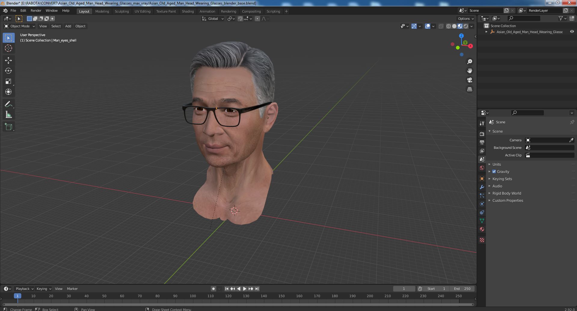 Asian Old Aged Man Head Wearing Glasses is a 3D model of head part of old, aged or senior male character with eyewear type eyeglasses (spectacles).