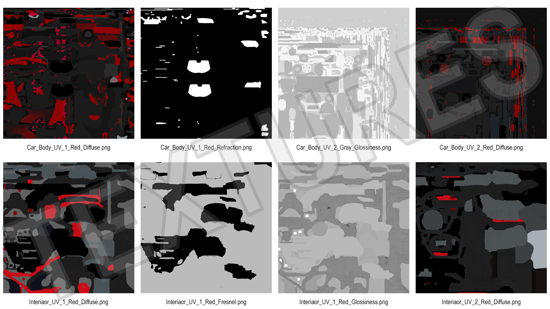 All textures and materials are included and mapped. (All colors can be easily modified.)