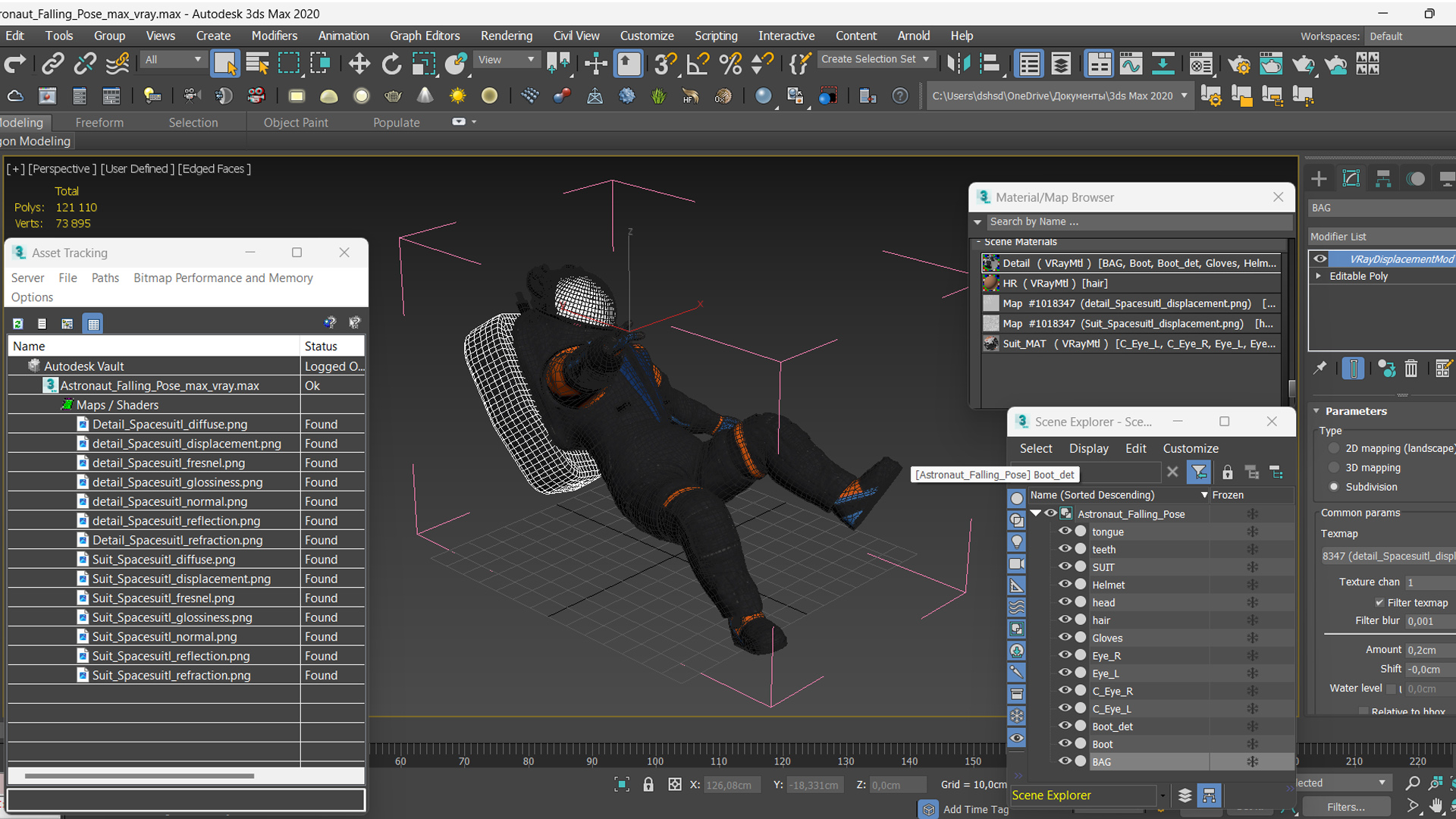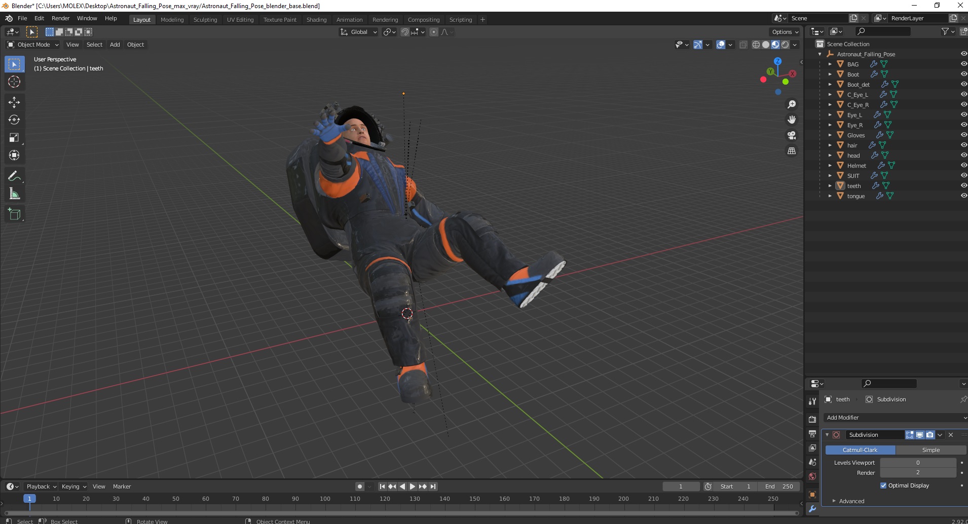 Astronaut Falling Pose is a high quality, photo real 3d model that will enhance detail and realism to any of your rendering projects. The model has a fully textured, detailed design that allows for close-up renders, and was originally modeled in 3ds Max 2020 and rendered with V-Ray. Renders have no postprocessing!