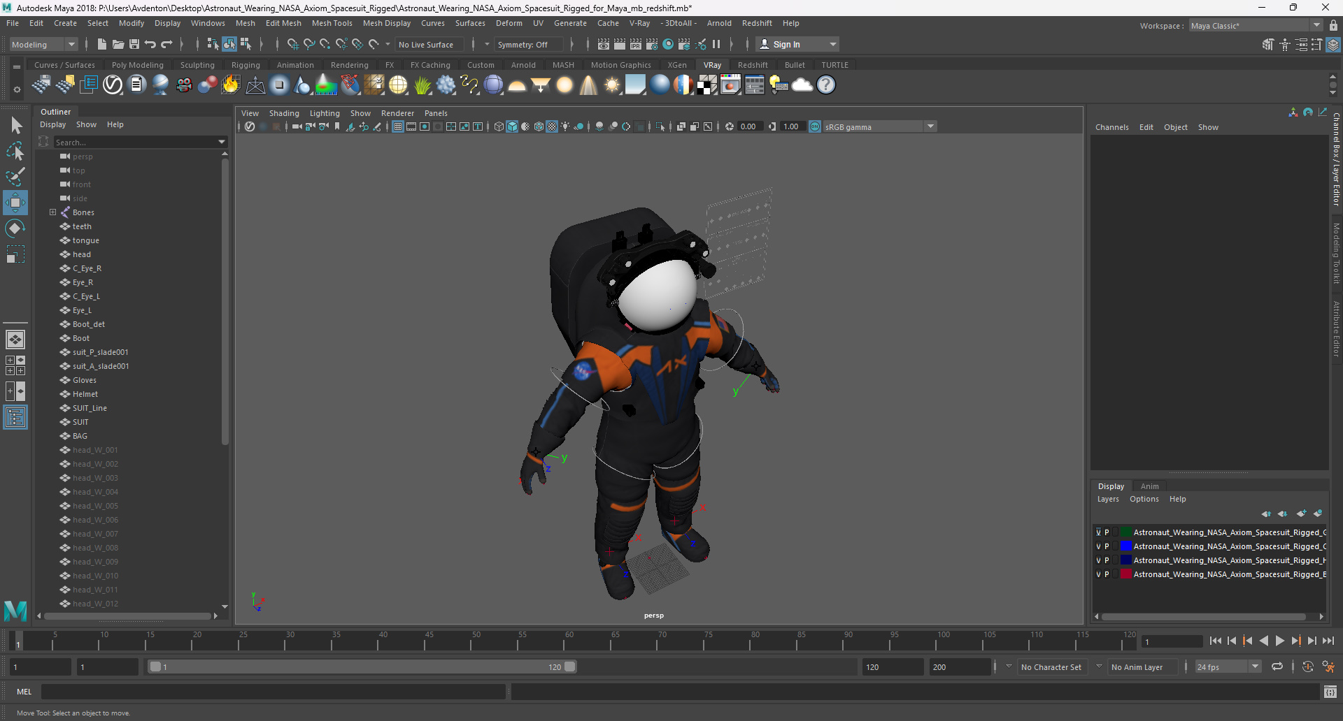 Astronaut Wearing NASA Axiom Spacesuit Rigged for Maya is fully rigged and is ready to be animated in Maya. You can easily position it the way you need or animate it the way your project requires. See the screenshots to get an idea of how rigging works. The pose of the model on the render images is an example and can be recreated using rig, it is not initially included into the product.
