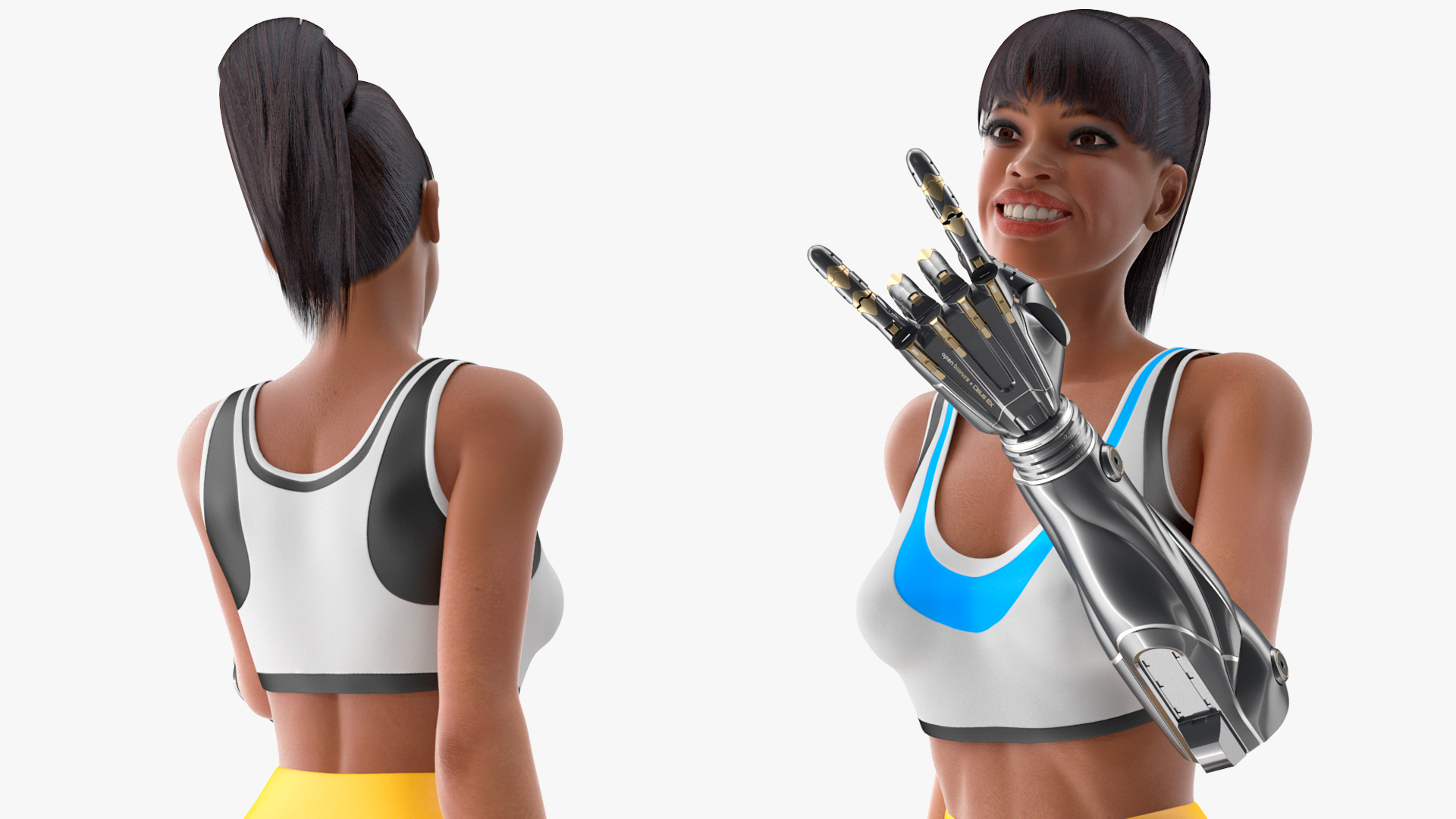 Athletic Woman with Futuristic Bionic Arm Rock Pose is a three-dimensional model of brave sporting female athlete with futuristic metal prosthetic arm, which is a specialized advanced artificial limb.