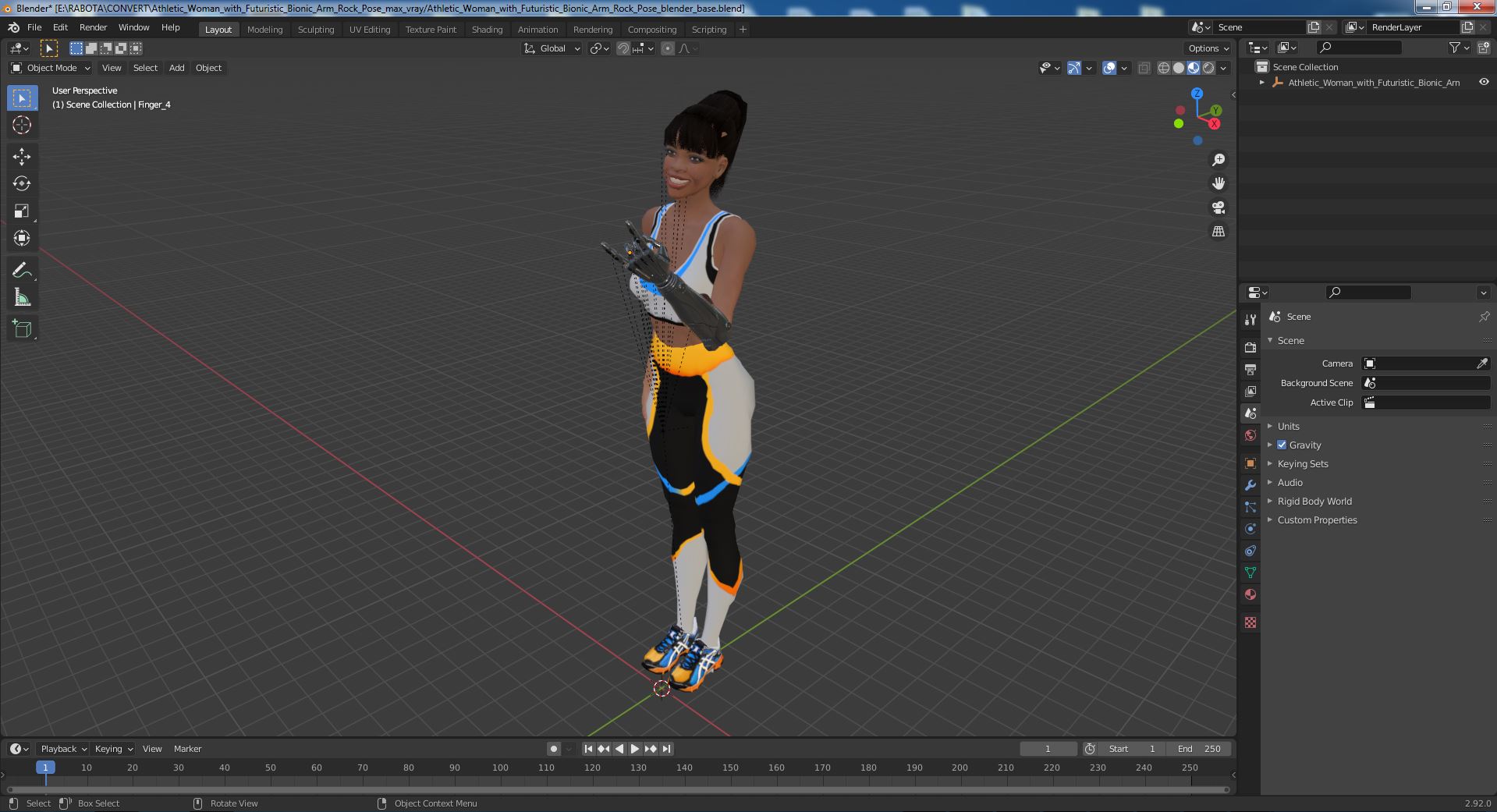 Athletic Woman with Futuristic Bionic Arm Rock Pose is a high quality, photo real 3d model that will enhance detail and realism to any of your rendering projects. The model has a fully textured, detailed design that allows for close-up renders, and was originally modeled in 3ds Max 2020 and rendered with V-Ray. Renders have no postprocessing!