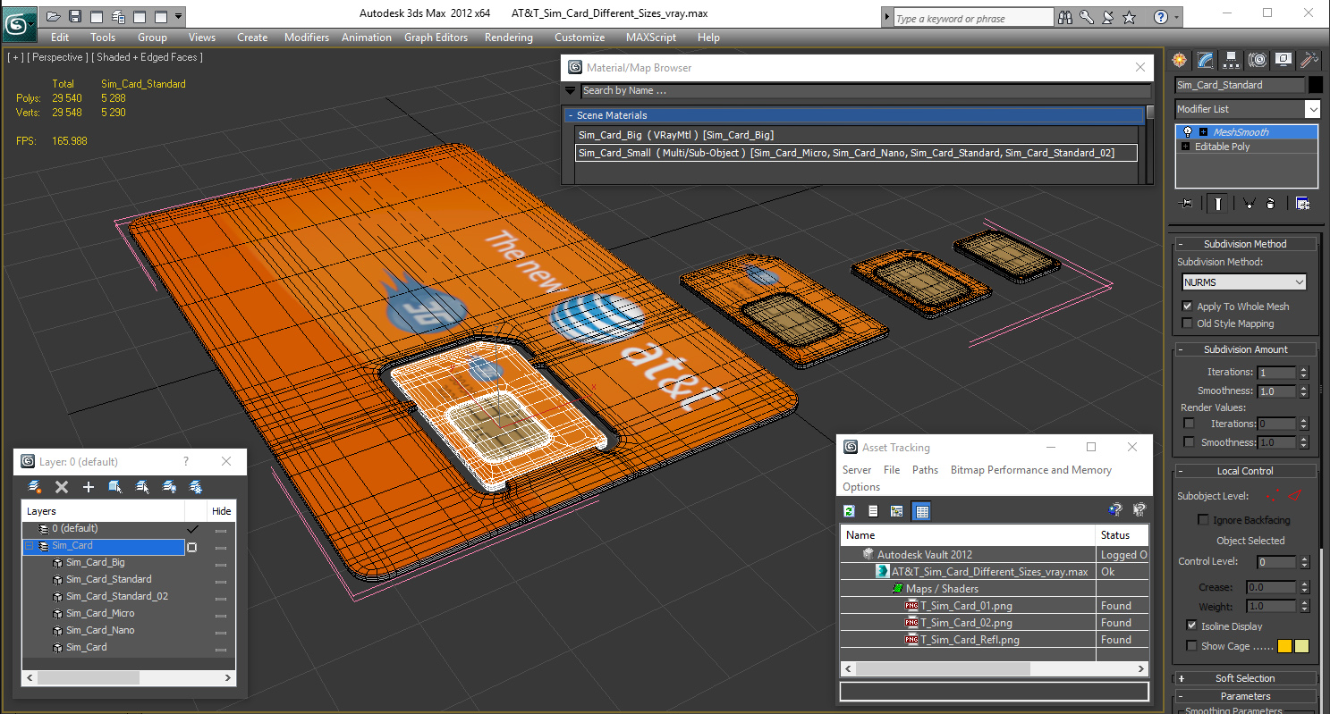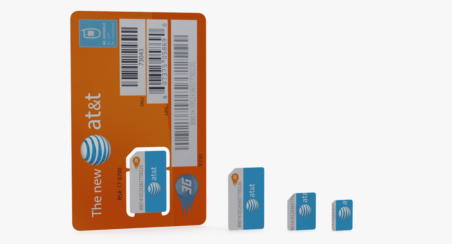 ATT Sim Card Different Sizes is a high quality, photo real 3d model that will enhance detail and realism to any of your rendering projects. The model has a fully textured, detailed design that allows for close-up renders, and was originally modeled in 3ds Max 2020 and rendered with V-Ray. Renders have no postprocessing!