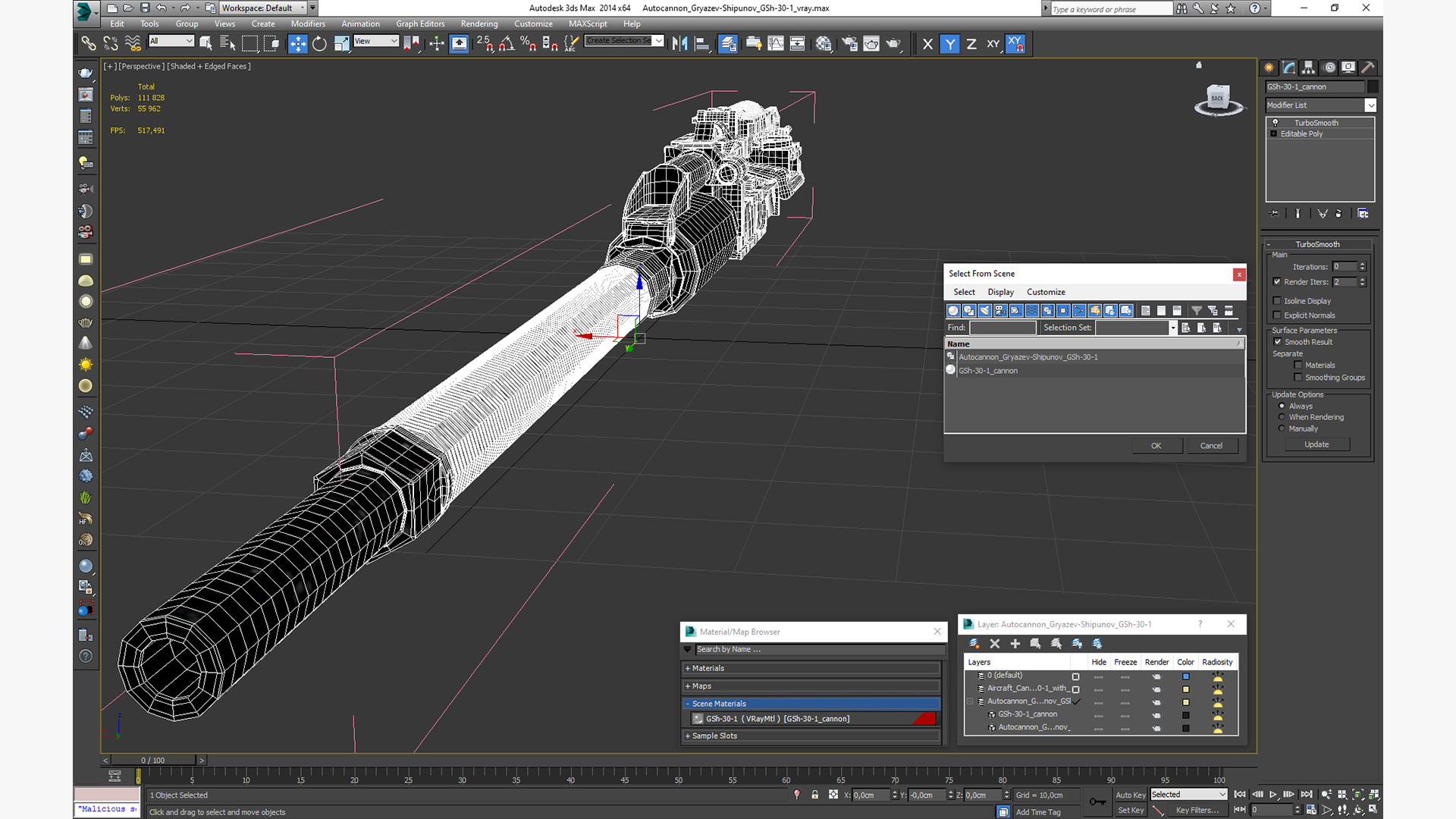 Autocannon Gryazev-Shipunov GSh-30-1 is a 3d model of 30mm aircraft autocannon developed by the Russian arms manufacturer, and is widely used in various military aircraft.