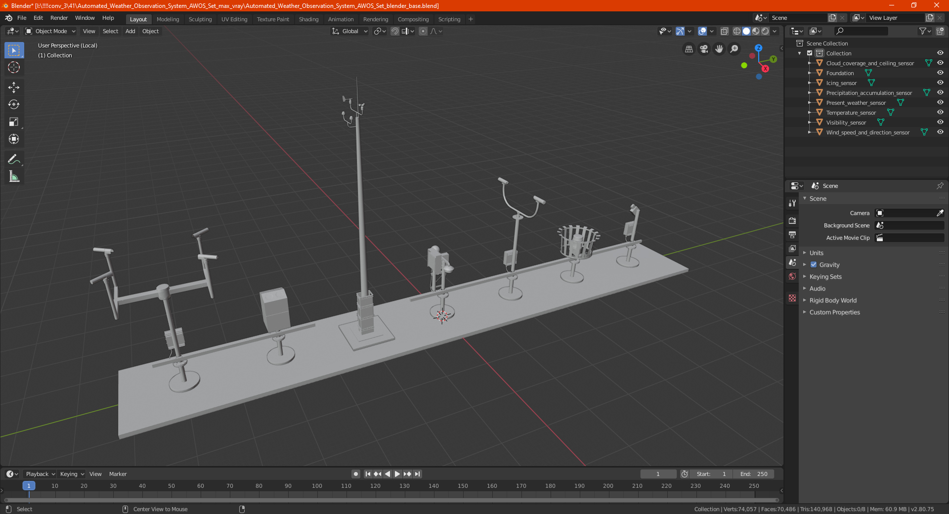 Automated Weather Observation System AWOS Set is a high quality, photo real 3d model that will enhance detail and realism to any of your rendering projects. The model has a fully textured, detailed design that allows for close-up renders, and was originally modeled in 3ds Max 2020 and rendered with V-Ray. Renders have no postprocessing!
