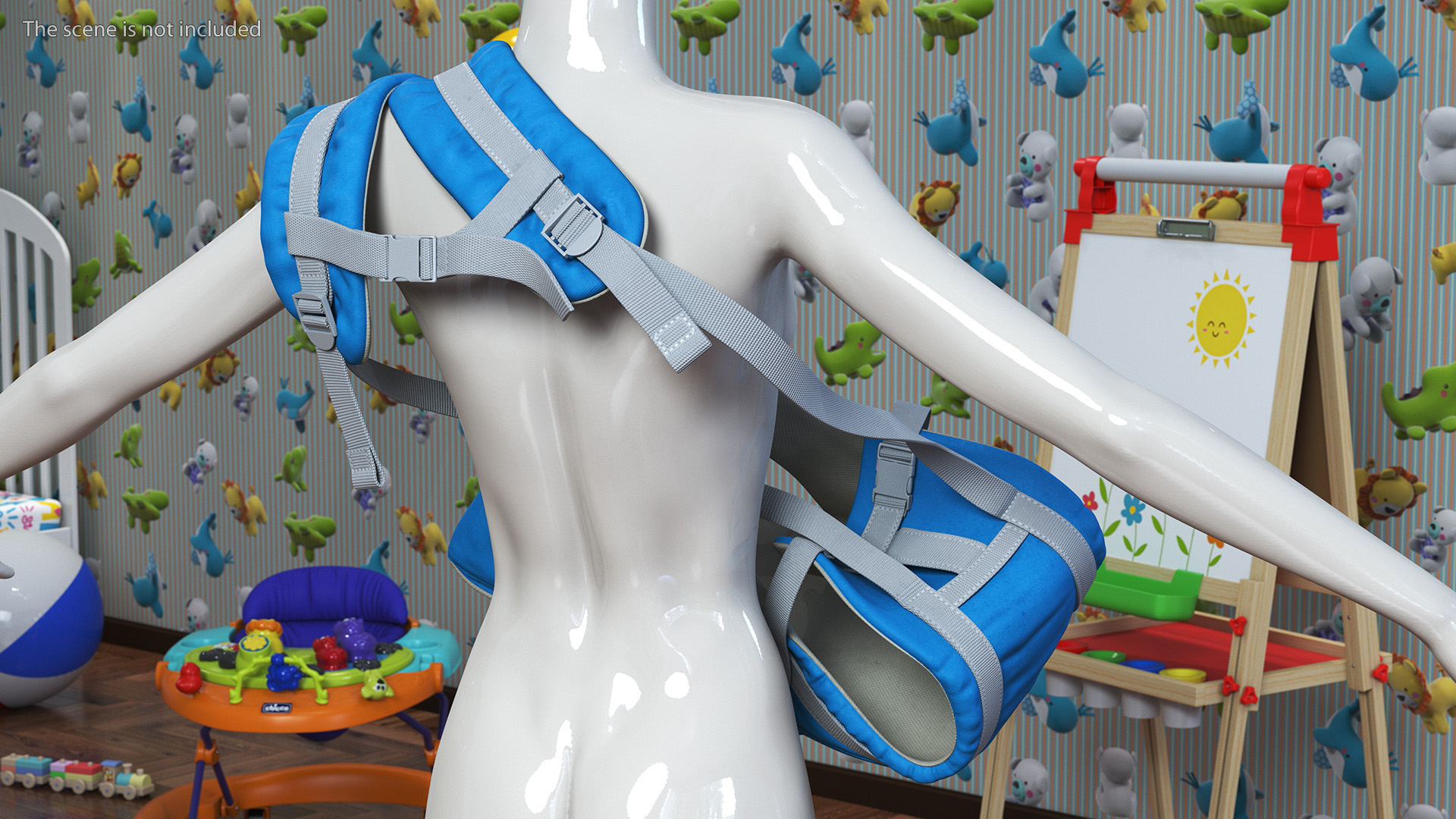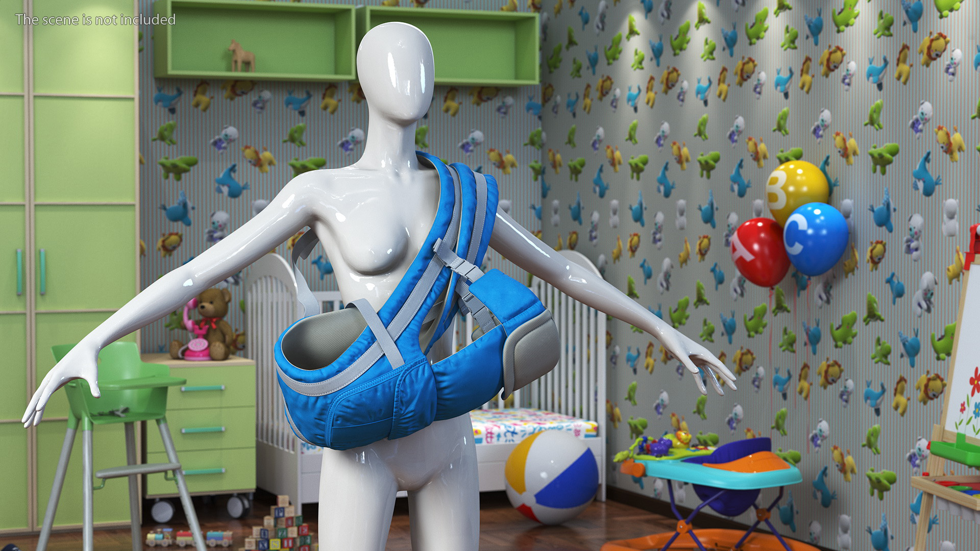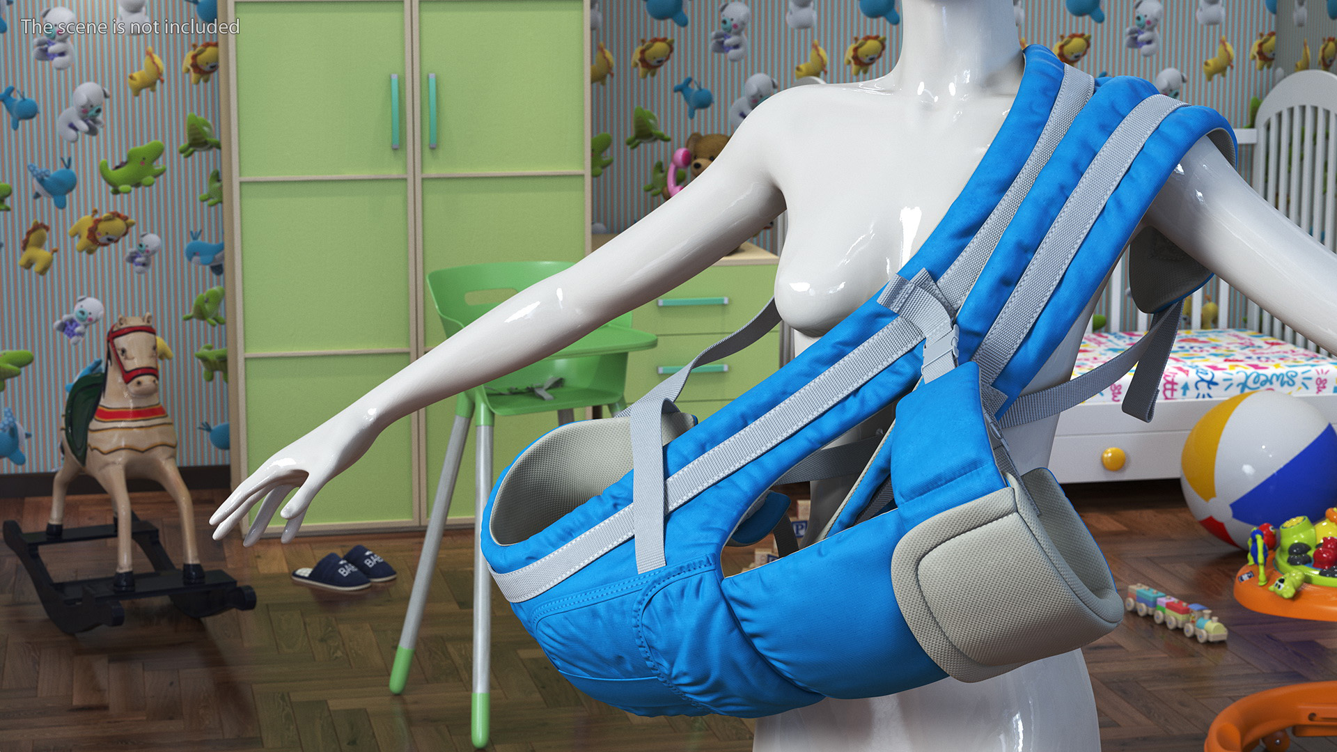 Baby Wrap Carrier Blue Lying Position is a three-dimensional model of modern adjustable infant carrier, often referred to as a babycarrier, kangaroo, baby backpack, baby sling or babywearer, which is a specialized baby-carrying device.