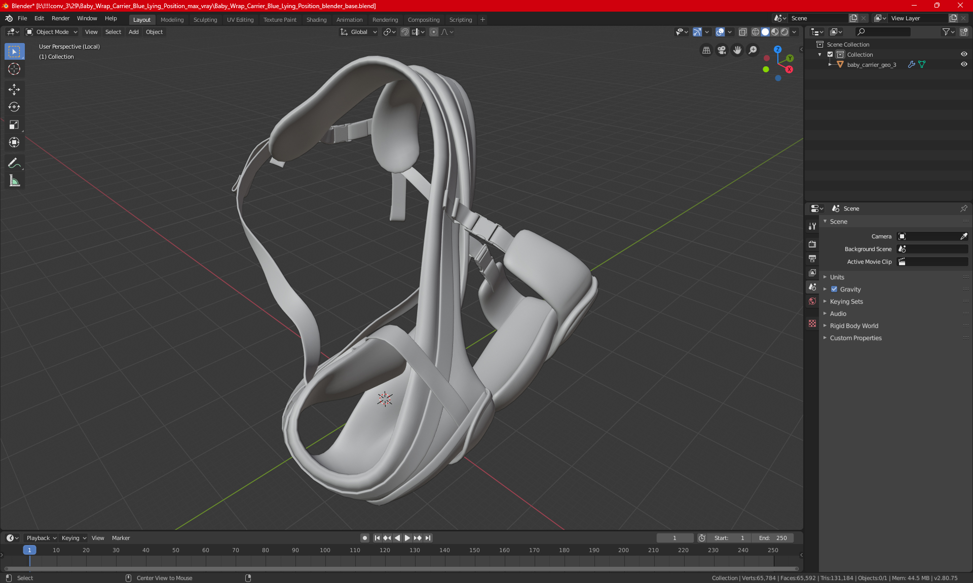 Baby Wrap Carrier Blue Lying Position is a high quality, photo real 3d model that will enhance detail and realism to any of your rendering projects. The model has a fully textured, detailed design that allows for close-up renders, and was originally modeled in 3ds Max 2020 and rendered with V-Ray. Renders have no postprocessing!
