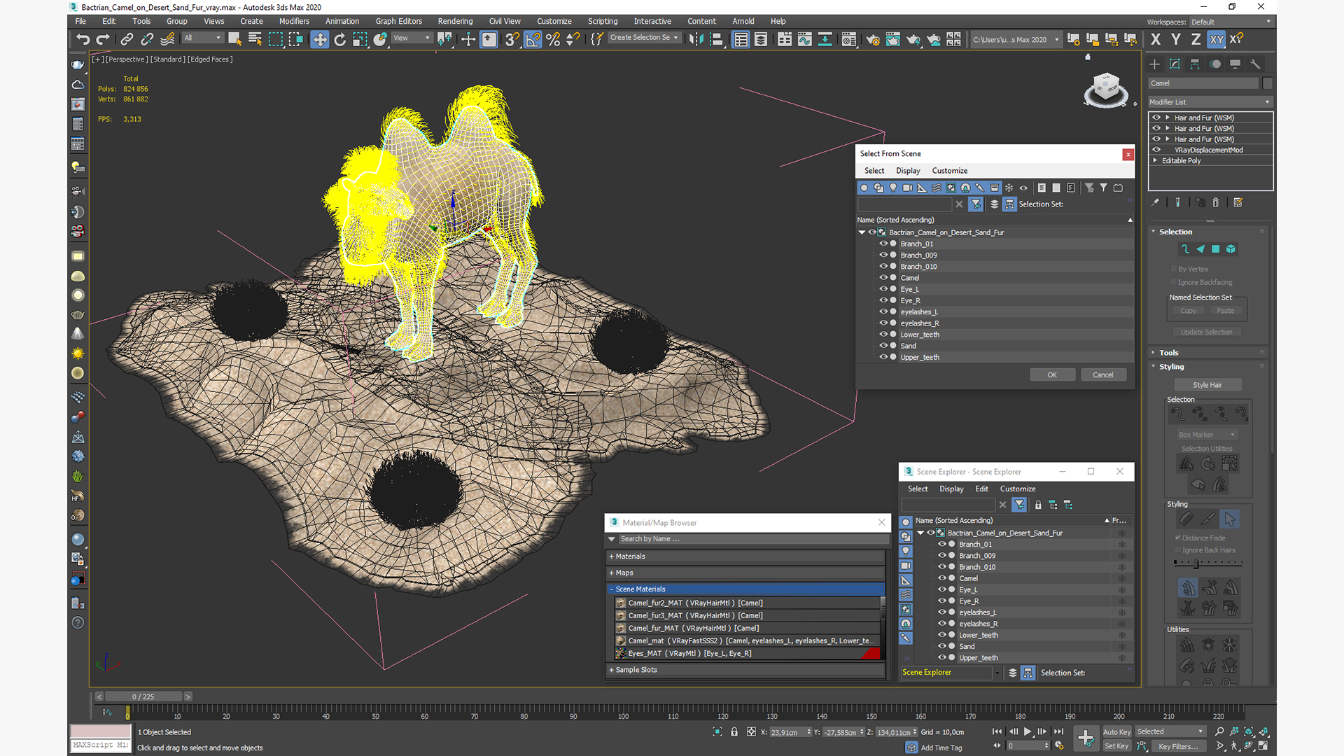Bactrian Camel on Desert Sand Fur has a 3dsmax Fur modifier, hair customizable (hair count, hair segments, hair color, root size, tip size, etc).
