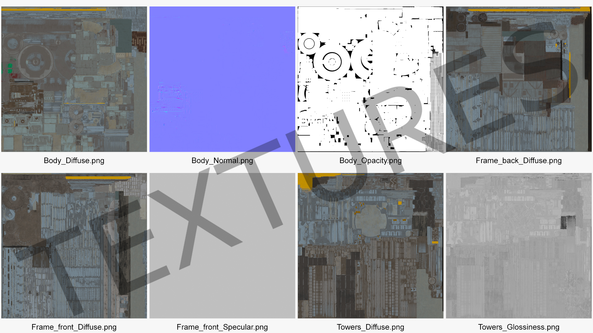 All textures and materials are included and mapped. (All colors can be easily modified.)