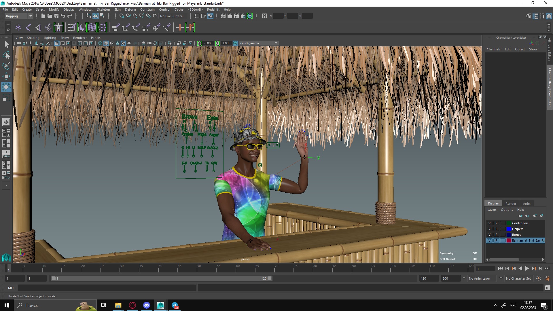 Barman at Tiki Bar Rigged for Maya is fully rigged and is ready to be animated in Maya. You can easily position it the way you need or animate it the way your project requires. See the screenshots to get an idea of how rigging works. The pose of the model on the render images is an example and can be recreated using rig, it is not initially included into the product.