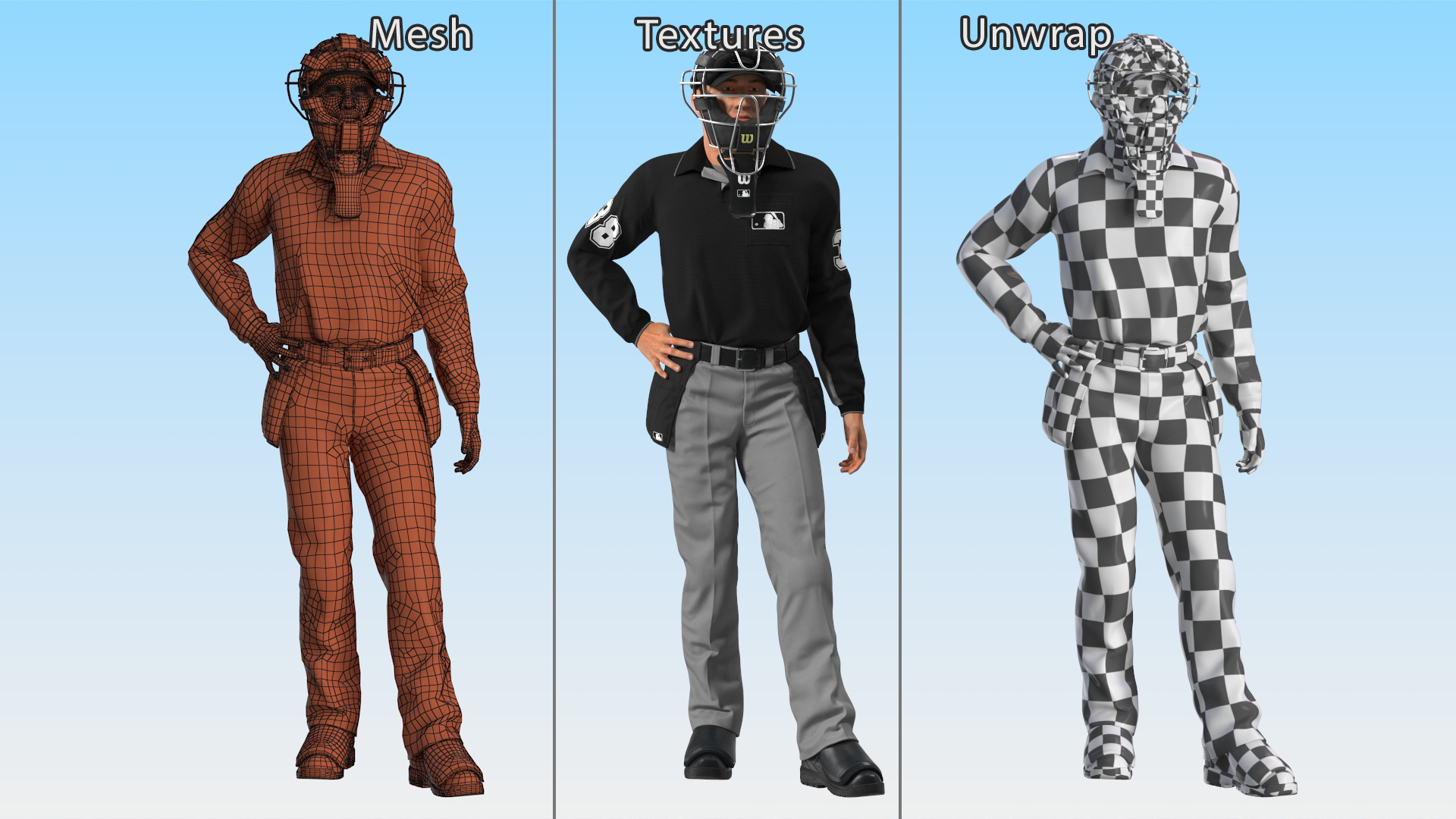 Baseball Umpire with Protective Mask and Cap Standing Pose Fur is a three-dimensional model of baseball umpire (referee) outfitted with a protective mask and cap is a vital figure in the game, responsible for enforcing the rules and making impartial decisions. The protective mask shields the umpire's face from potential injury due to fast-moving balls, ensuring their safety while maintaining focus on the game. Additionally, the cap provides sun protection and enhances visibility, allowing the umpire to accurately judge plays. This attire not only safeguards the umpire but also upholds the integrity of the game by enabling fair and unbiased officiating.