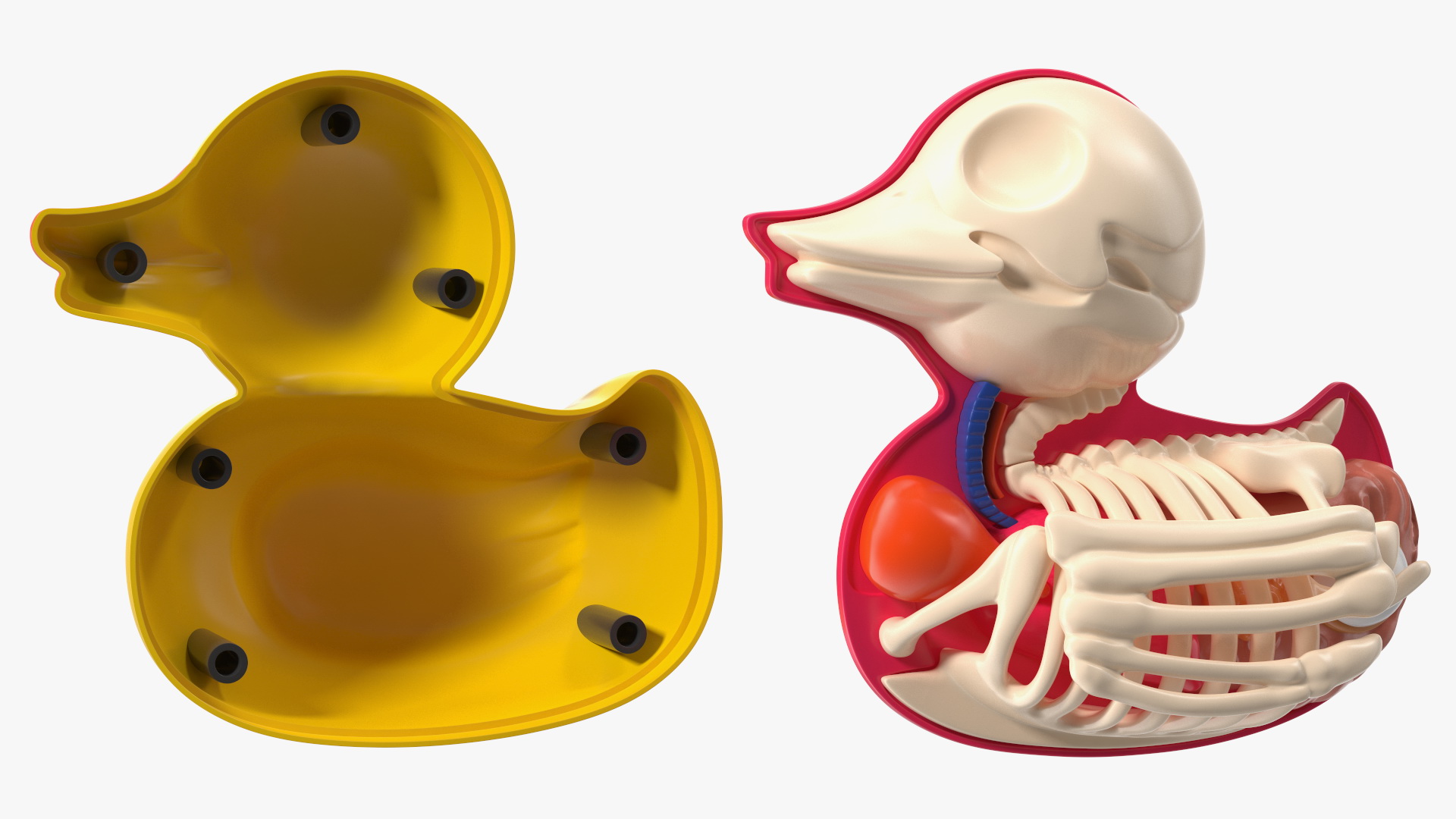 Funny anatomical style bath time toy (rubber ducky like model) which is reminiscing of innocent childhood mascot. Anatomical toy sculpture with detach parts of it's anatomy feature and sculpted foam made system of organs and bones. Comical educational model which is superimposition of childlike toy with anatomy details.